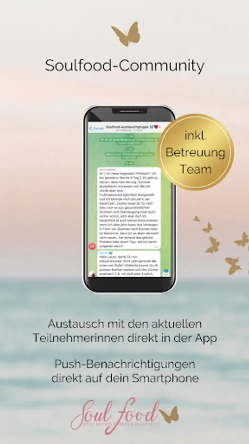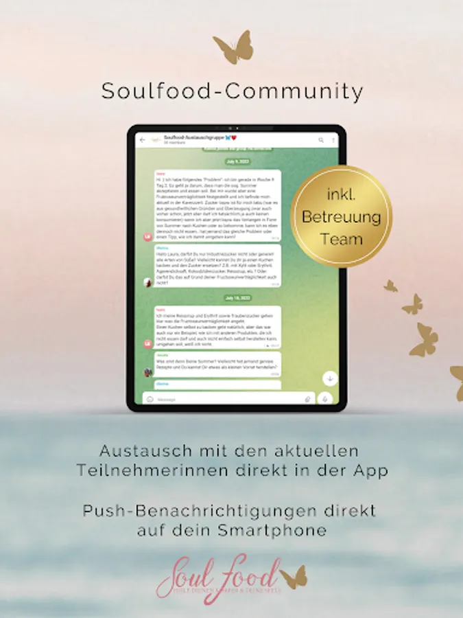 Our soul food community is a protected area where women can exchange information about their suffering and problems with their body and/or food and finally talk freely about it. Here you will be understood, seen, heard, felt and you can exchange your challenges, thoughts and insights every day.