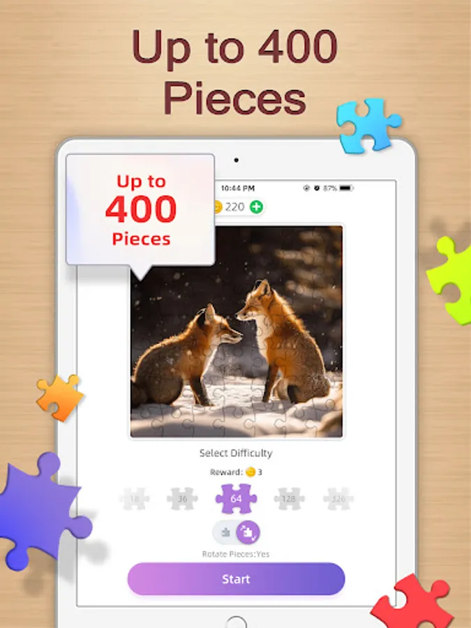• From 36 to 400 picture puzzle pieces. The more pieces, the harder your jigsaw puzzle game becomes