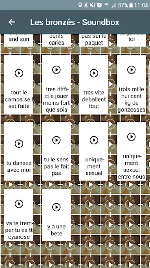 Play now the best memes and buzz phrases of different films bronzed! Discover the best cult phrases Gigi, Jerome, Christiane, Jean-Claude Bernard, Nathalie, Popeye, Bobo and Bourseault! Laugh now with our beautiful soundboard and replay the best of the same film bronzed! Soundbox download now!