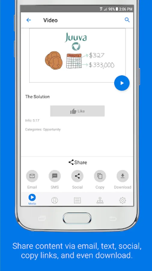 This app simplifies contacting a prospect with information about the Juuva opportunity! Choose from a vast selection of content: Product and opportunity videos, PDFs and more to share via email, text, and your favorite social media platforms.
