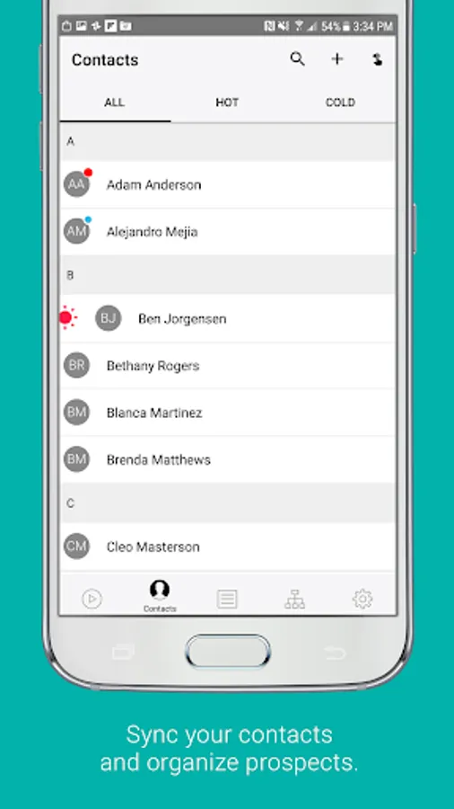 Contacts: Choose how to sync and manage your contacts. Swipe to sort them by interest level. You can make connections, add notes, or check out the Contact Feed to see the tools you've shared and contact actions.