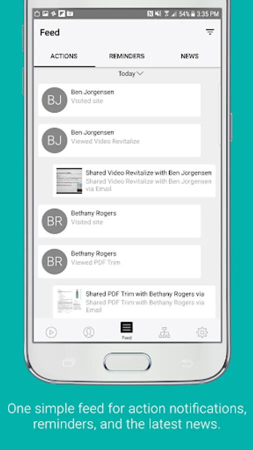 Feed: Keep track of everything you've shared and see what your contacts have viewed with notifications. You can even swipe notifications to mark them as a Reminder. News also brings all of the latest announcements and social posts from corporate straight to you in one convenient place!