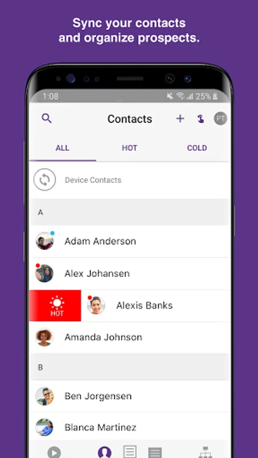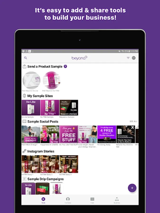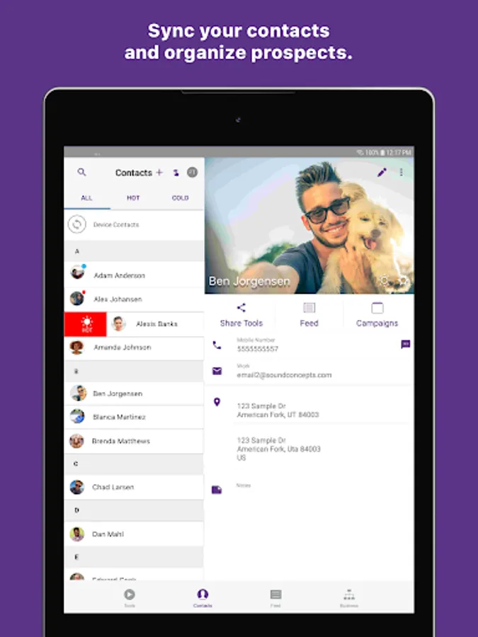 Contacts: Choose how to sync and manage your contacts. Swipe to sort them by interest level. You can make connections, add notes, or check out the Contact Feed to see the tools you've shared and contact actions.