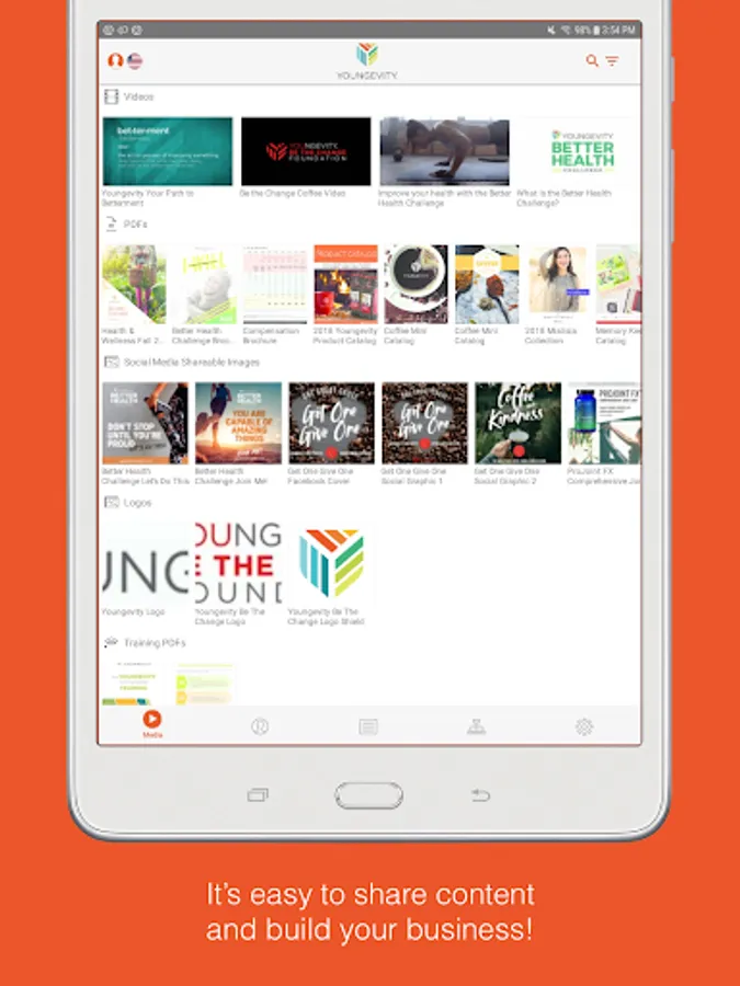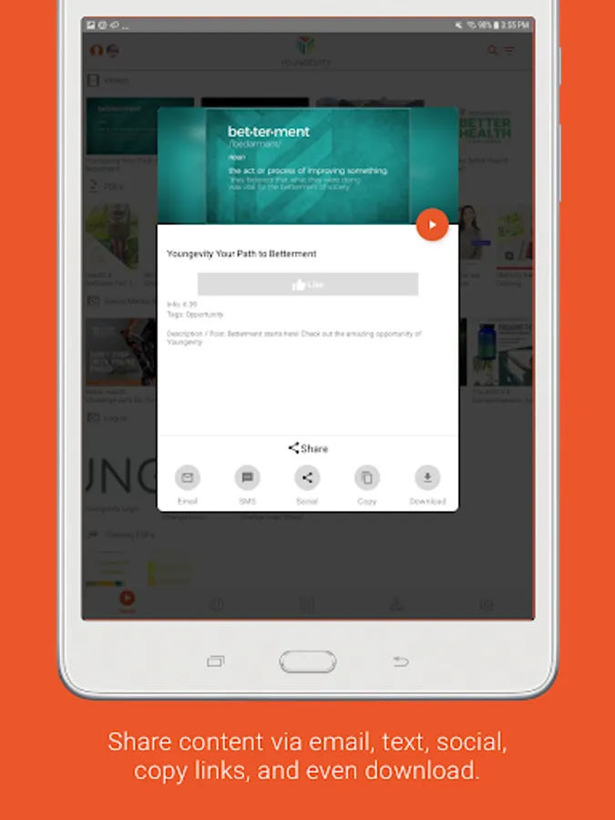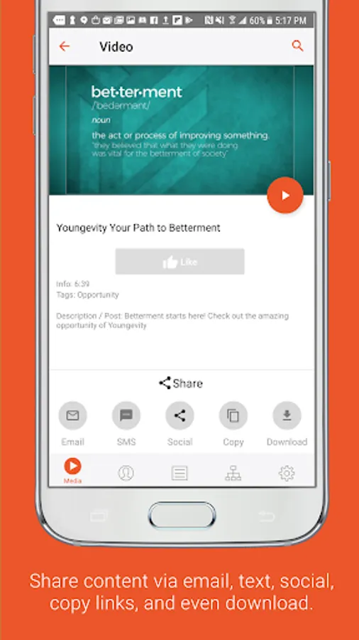 Media: It has never been easier to share information about your products and opportunity via SMS text, email, or social media. Simply choose from the library of content and digital tools specifically designed to promote your business and share them with a contact. You'll even receive a notification when they view the tools so you know exactly when to follow up! No data connection? No problem! Simply download content in the app beforehand for offline playback.