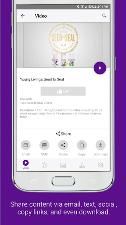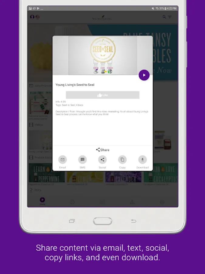 Tools: It has never been easier to share information about your products and opportunity via SMS text, email, or social media. Simply choose tools specifically designed to promote your business and share them with a contact. You'll receive a notification when contacts view a tool so you know exactly when to follow up! No data connection? No problem! Simply download tools such as videos in the app beforehand for offline playback.