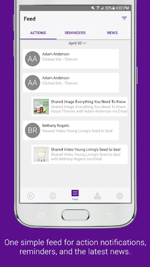 Feed: Keep track of everything you’ve shared and see what your contacts have viewed with notifications. You can even swipe notifications to mark them as a Reminder. News also brings all of the latest announcements and social posts from corporate straight to you in one convenient place!
