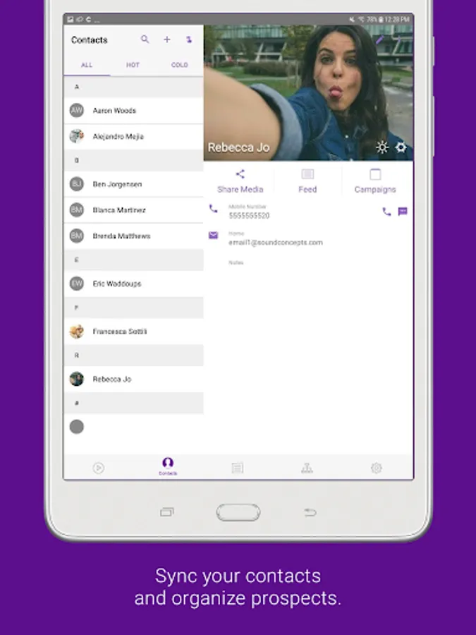 Contacts: Choose how to sync and manage your contacts. Swipe to sort them by interest level. You can make connections, add notes, or check out the Contact Feed to see the tools you've shared and contact actions.