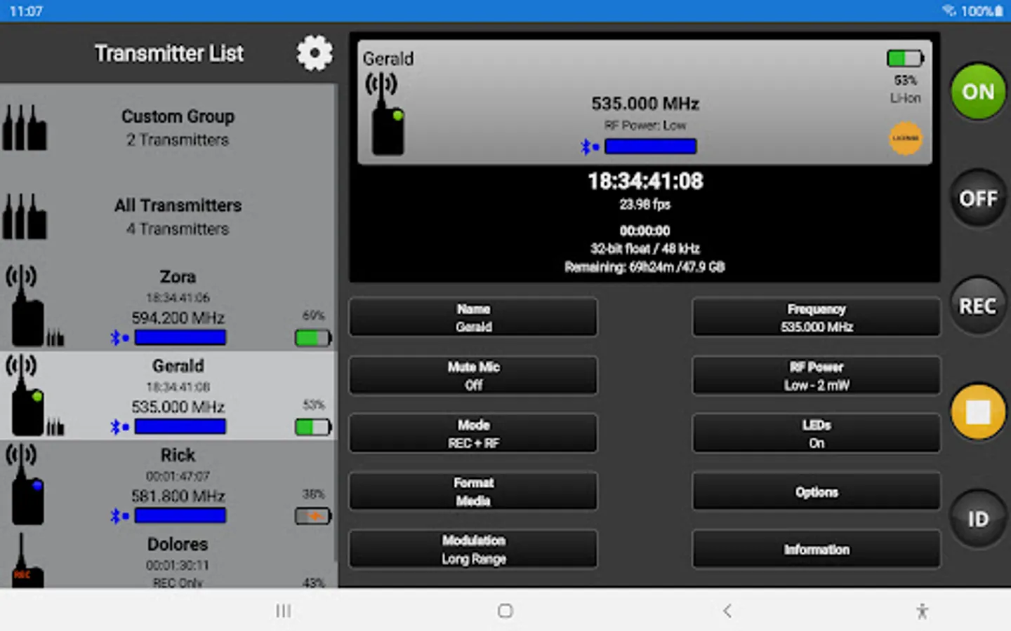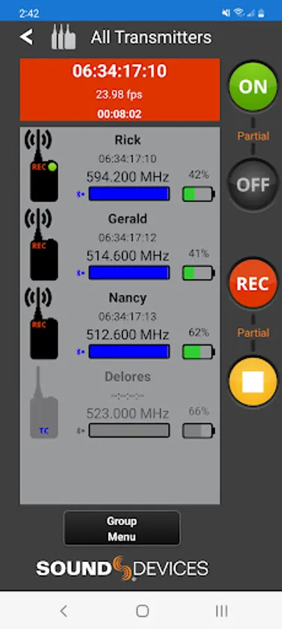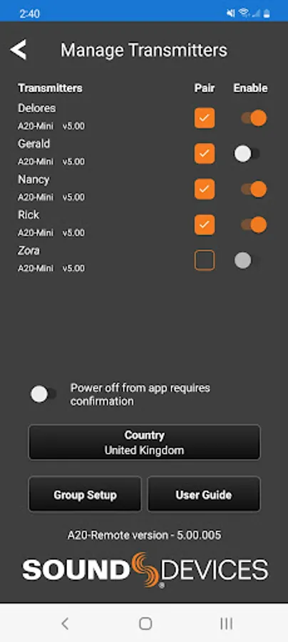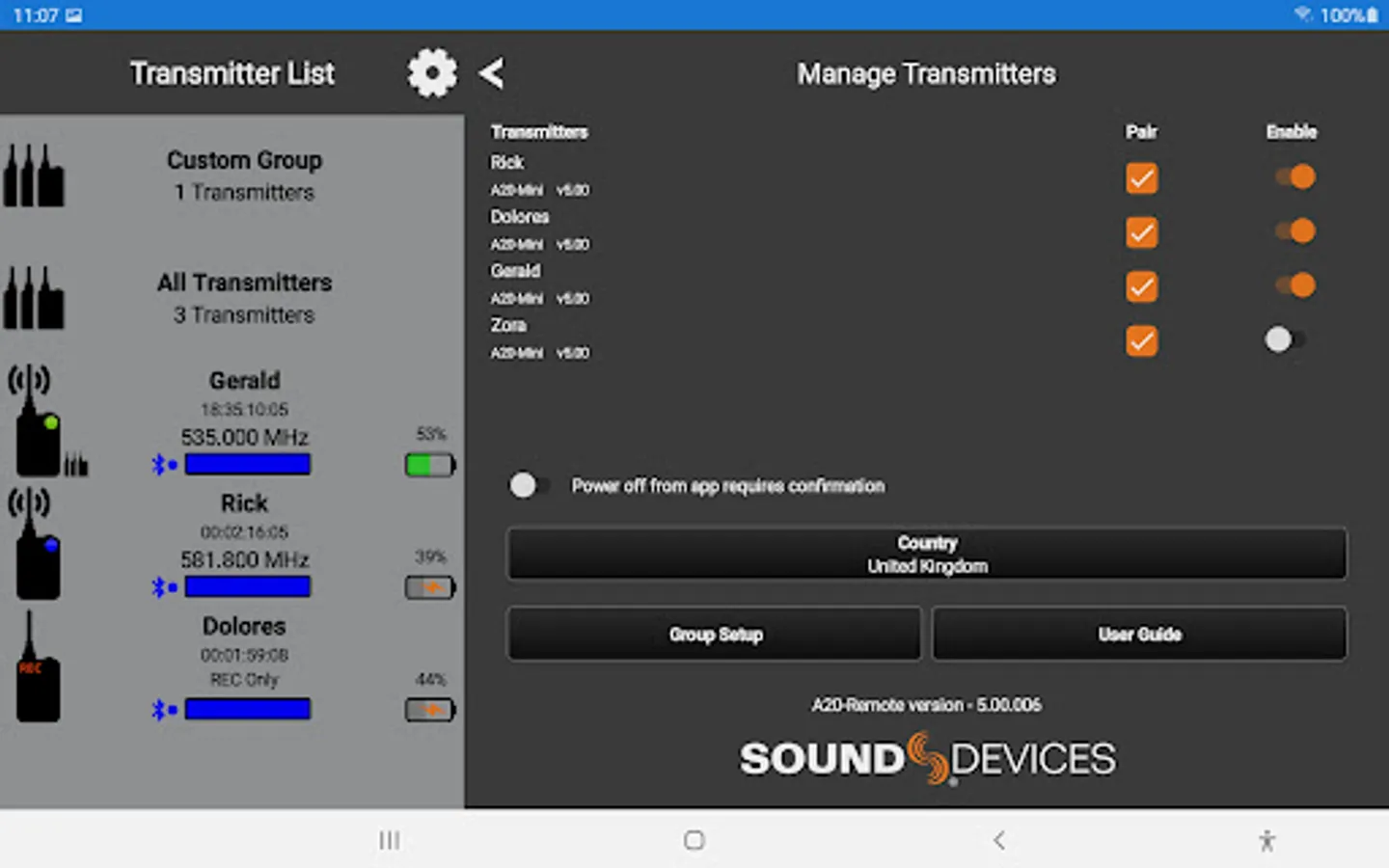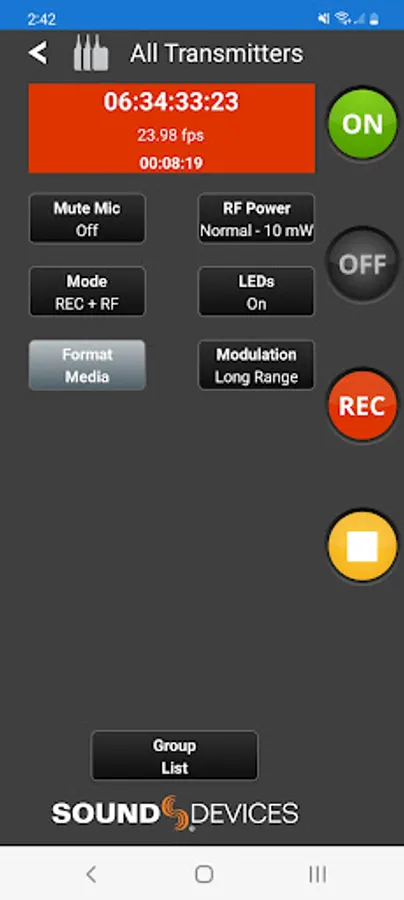 When connected via Bluetooth LE to the Sound Devices A20-Mini or A20-TX, A20-Remote offers control and display of the transmitter parameters, including: