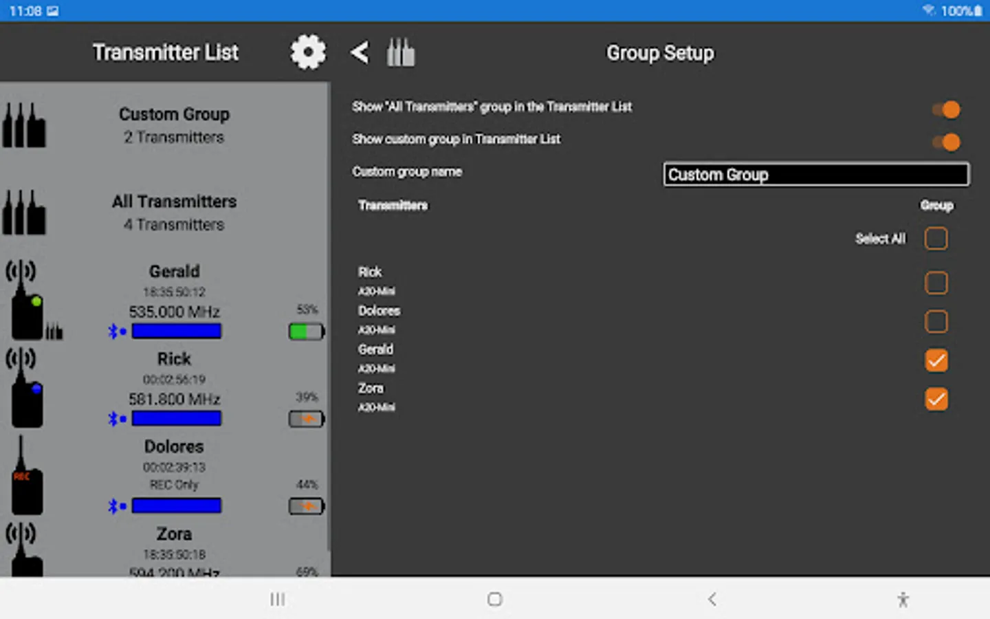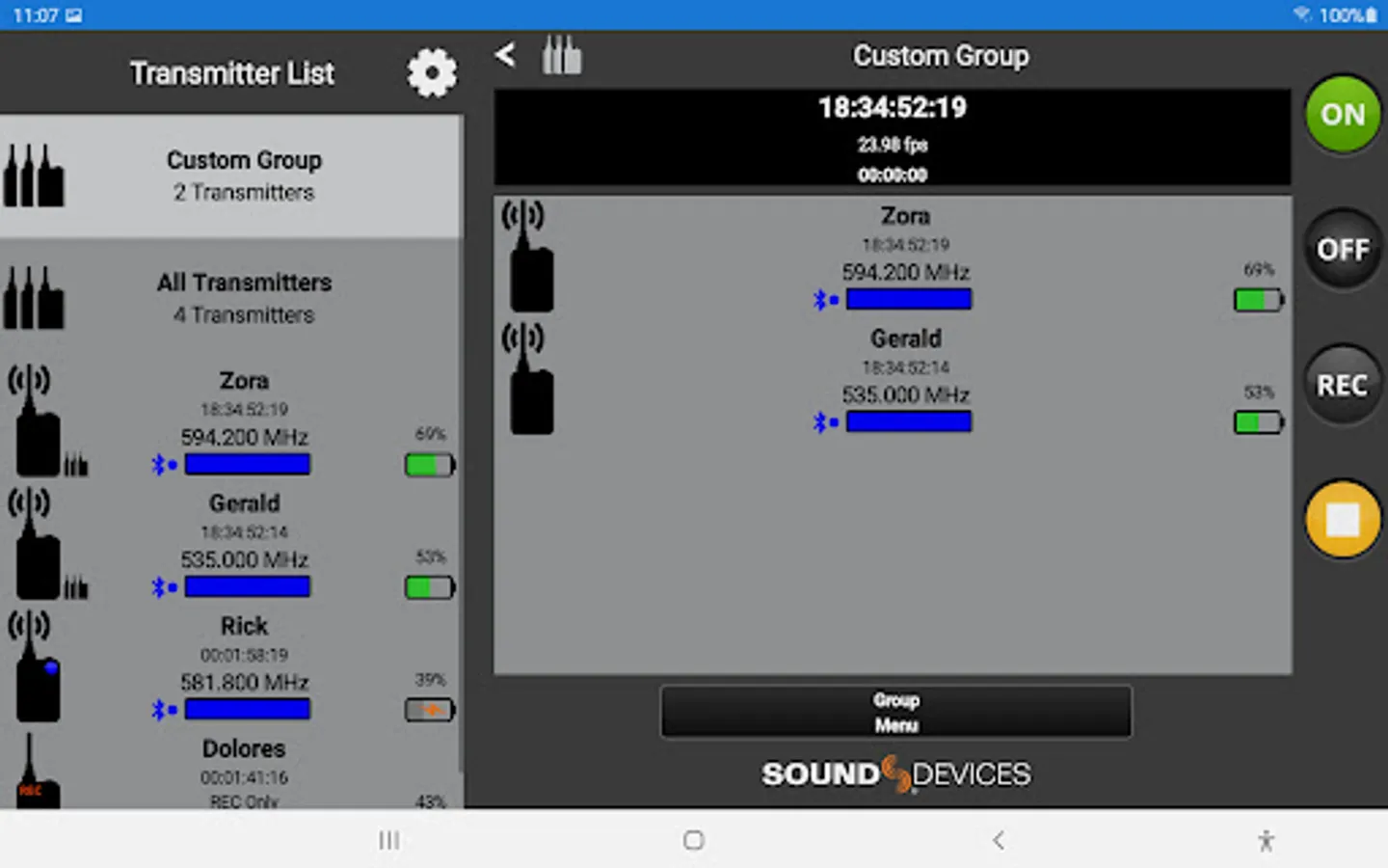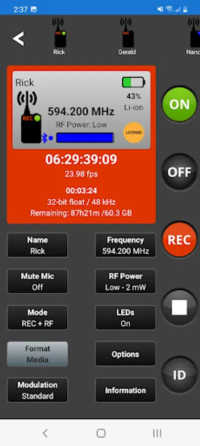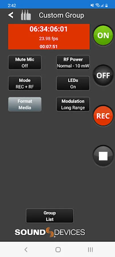 When connected via Bluetooth LE to the Sound Devices A20-Mini or A20-TX, A20-Remote offers control and display of the transmitter parameters, including: