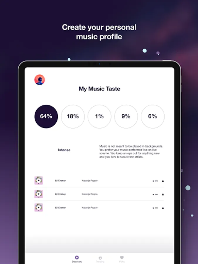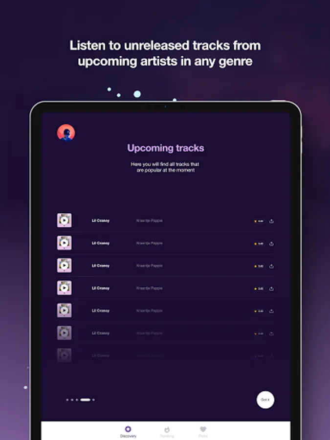 Enjoy discovering new talents in any genre, rating tracks uploaded by real artists and voting on the next potential hit. You can save tracks in your Favourites before their release and listen to all the tracks for free and without adverts.