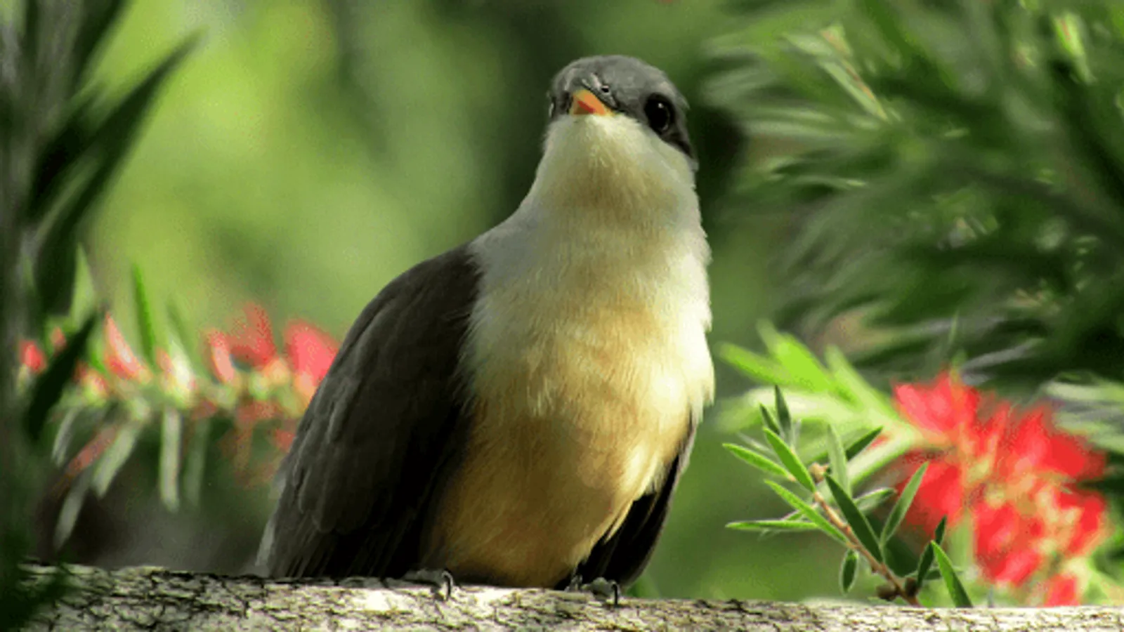 Male Yellow-Billed Cuckoos make a distinctive series of hollow, wooden-sounding ka-ka-ka-ka-ka-kow-kow-kowlp-kowlp-kowlp-kowlp syllables. The whole series is quite slow and gets slower toward the end; calls can last up to about 8 seconds. Both members of nesting pairs give a metallic, rattling call, and a series of kow-kow-kow notes that sounds like a metal door knocker hitting a strike plate.
