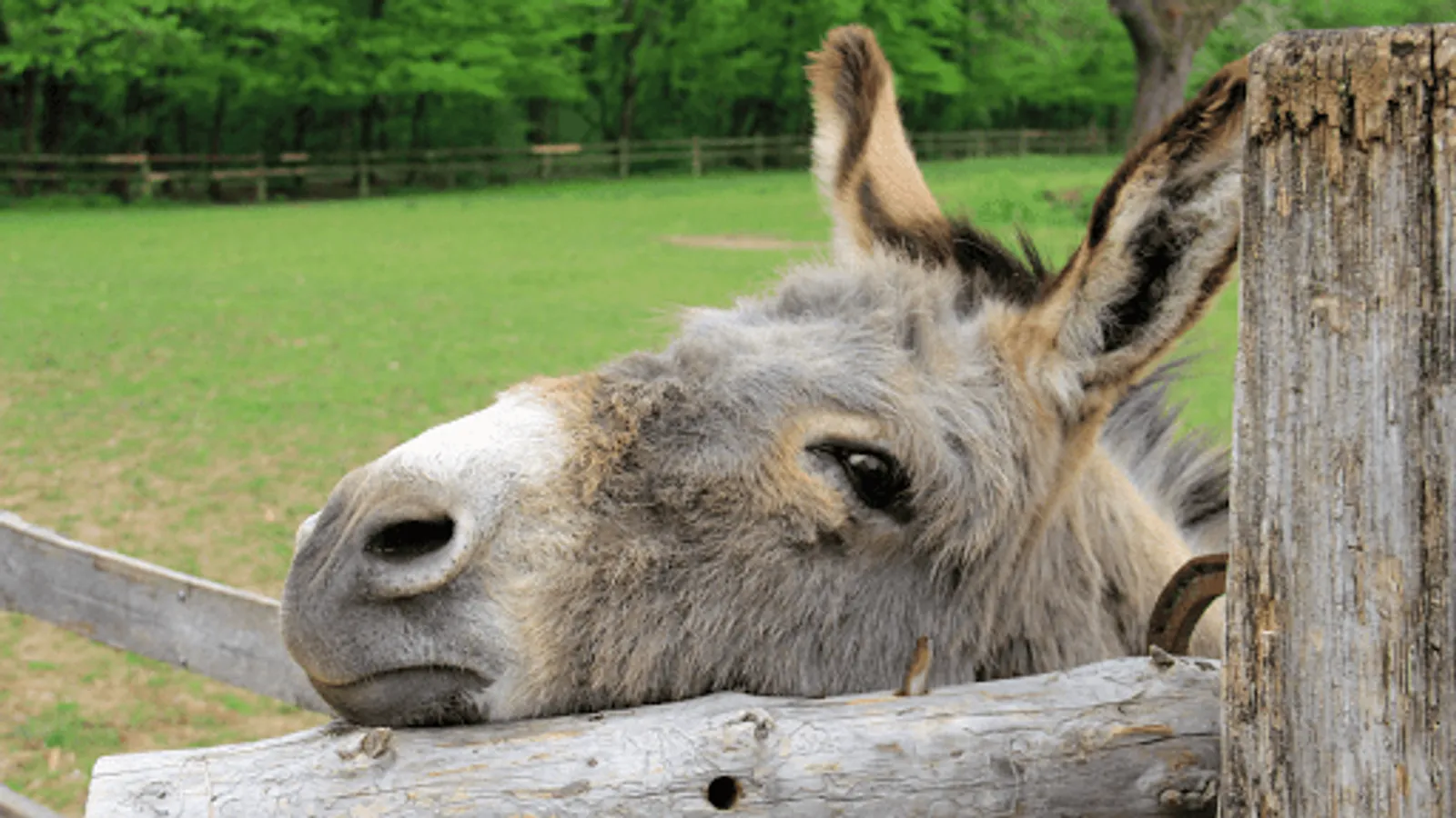 The donkey or ass, Equus africanus asinus, is a domesticated member of the horse family, Equidae. The wild ancestor of the donkey is the African wild ass. The donkey has been used as a working animal for at least 5000 years. Wild donkeys, called burros, live in desert plains, where they survive on little food and water for long periods. Donkeys have a two-toned call that sounds pretty funny. In English, this sound is called braying, and is written as hee-haw.