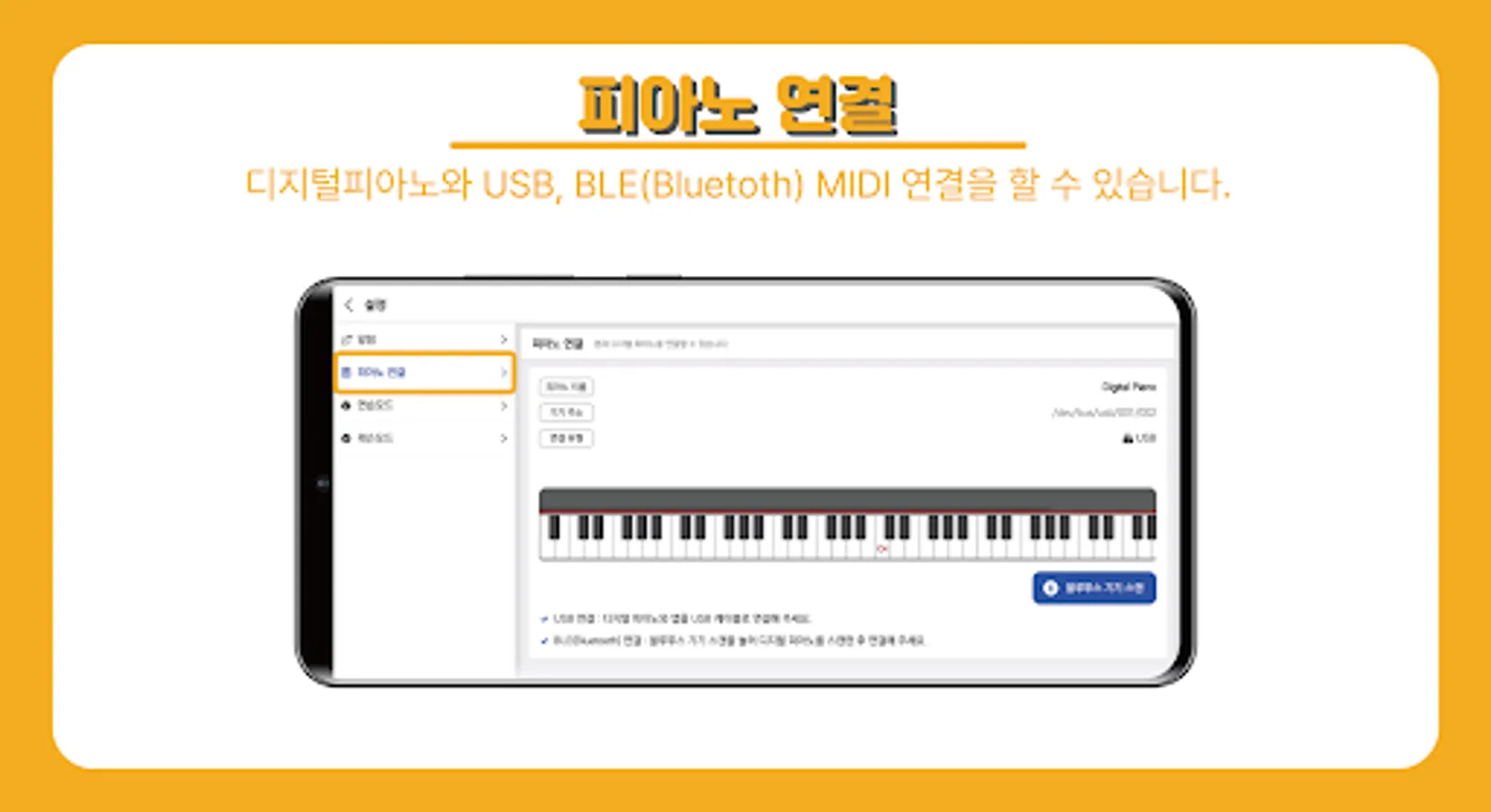 Play the piano by connecting the piano class app and digital piano to USB and Bluetooth MIDI.