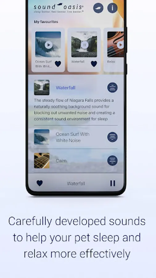 Sound Oasis® is the world leader in sound therapy systems. We take sleep, relaxation and tinnitus seriously. This APP is all about helping your pet sleep and relax more effectively, especially when life gets stressful and noisy for them (e.g. adjusting to your new work schedule, new homes, frightening fireworks, construction/traffic noise, etc.). We are passionate about providing the best sound experience possible to improve lives. This APP provides "made for pet" sounds that were doctor composed and/or selected for better results.