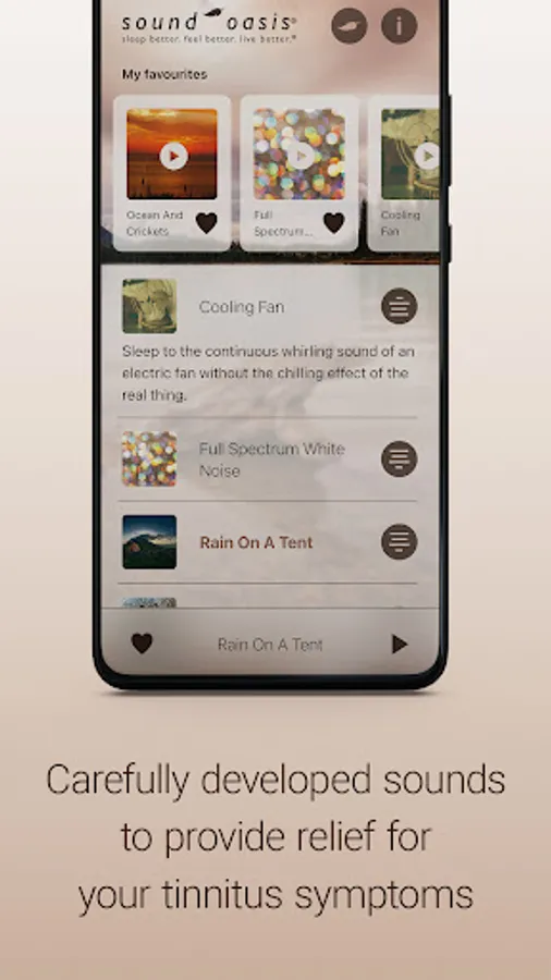 The sounds in this app can be an effective tool to manage your tinnitus using sound therapy and sound masking to make tinnitus symptoms less noticeable. This masking effect can be particularly effective at night when the surrounding environment is quieter. By listening to pleasant sounds, particularly sounds close to the frequency level of your tinnitus symptoms, your brain will predominantly hear the pleasant sound instead of the annoying tinnitus noise.