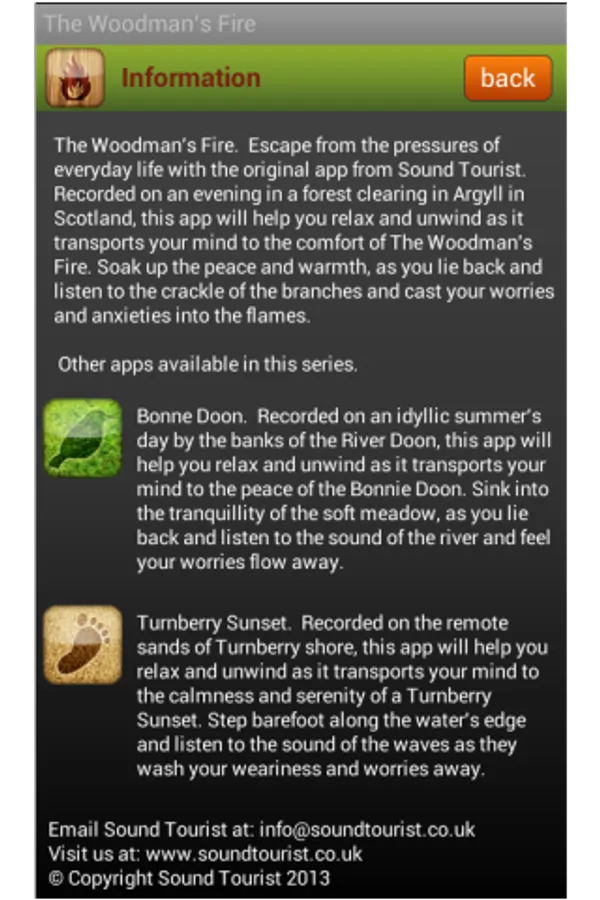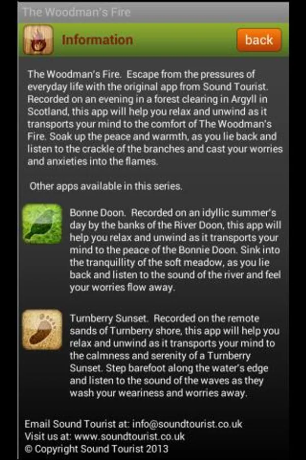 Escape from the pressures of everyday life with the original app from Sound Tourist. Recorded in a forest clearing in Argyll in Scotland, this app will help you relax, unwind and sleep as it transports your mind to the comfort of The Woodman’s Fire. Soak up the peace and warmth, as you lie back and listen to the crackle of the branches and cast your worries and anxieties into the flames.