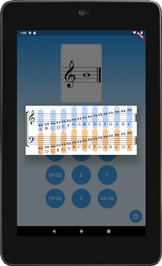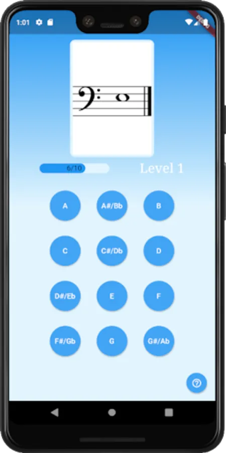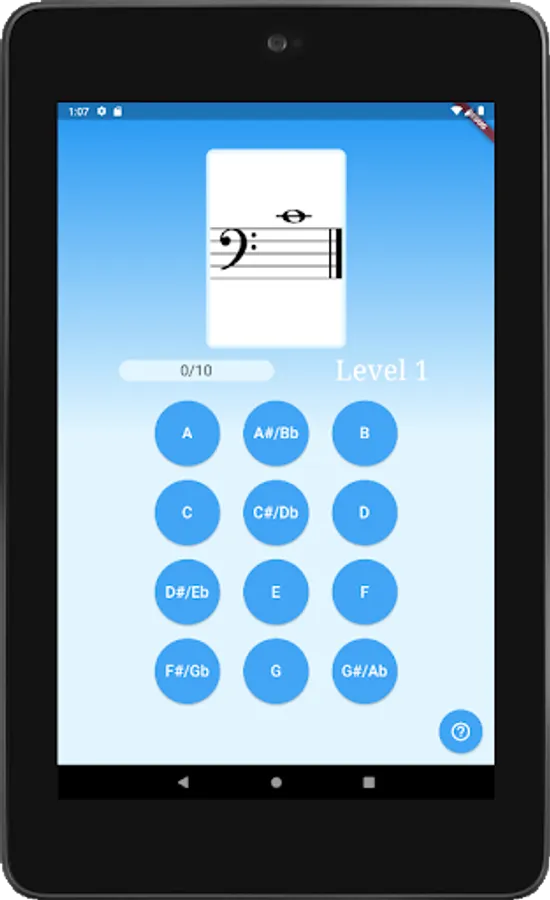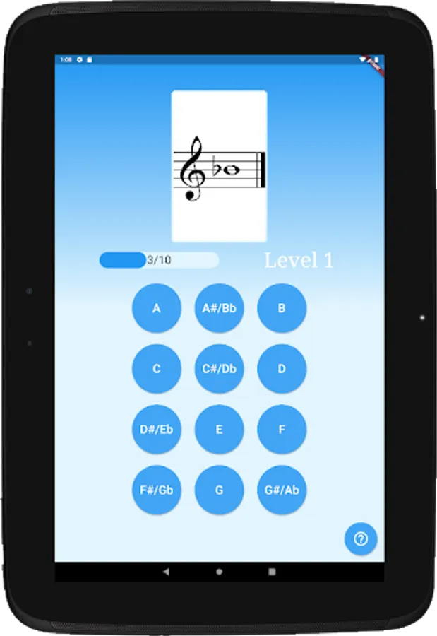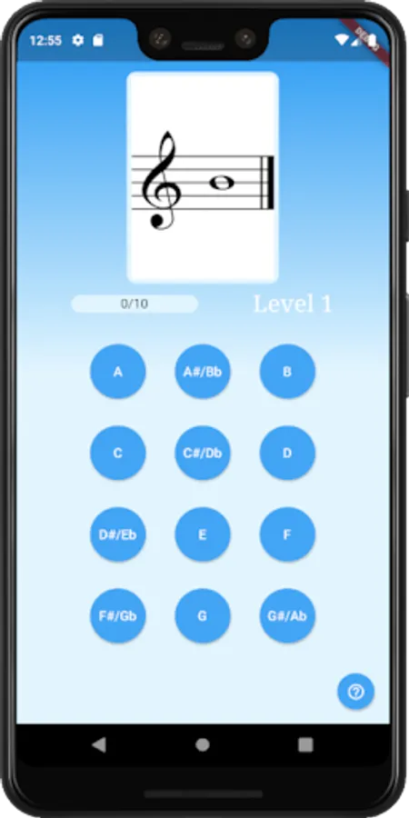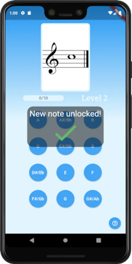 The app starts at level one, in which you must correctly identify one of two notes. Once you can identify the two notes ten times in a row without mistakes, Note Maestro unlocks level two by adding a third note. The app is progressive and continues until you have mastered all of the notes you need in order to read music.