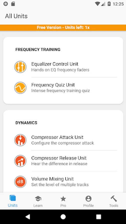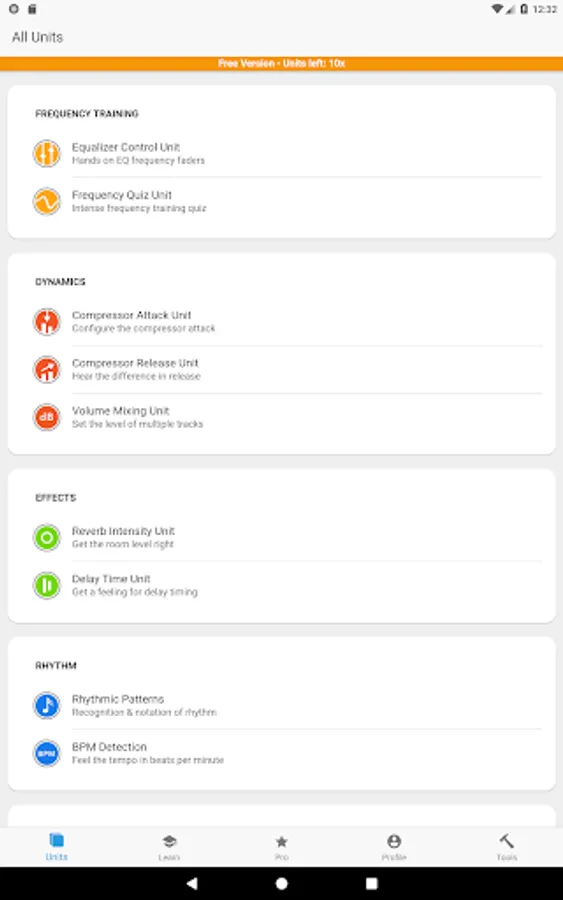 With this free download you can start up to 10 training units. If you find the app useful, you can opt for an "All-Access" auto-renewing 1-year subscription for $12.99, which will give you unlimited access to all of the app's features and training units. Access to the metronome, tone generator, and BPM tapper tools are always available to use for free, regardless of whether or not you choose to purchase a subscription.