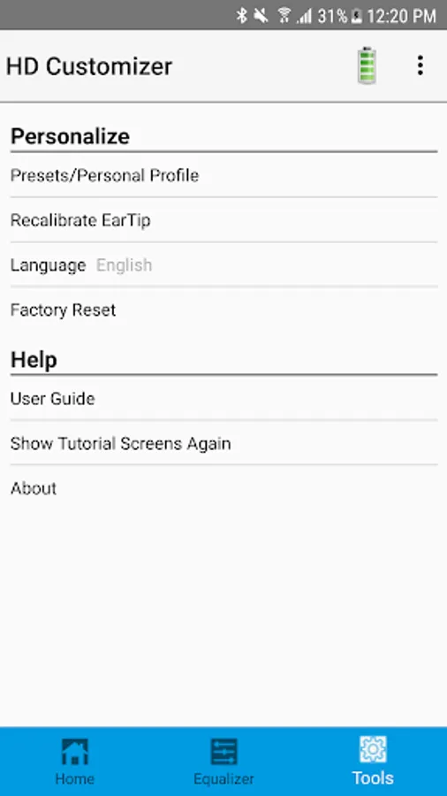 Finally, the "Tools" tab gives you the ability to change the language of the voice prompts in the HD75. You can also access the User Guide for the HD75 app from the "Tools" tab.