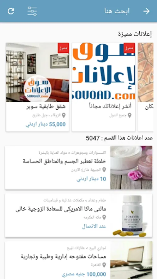 Do you want to earn money from things you no longer need? Or maybe you are looking for something new or used you need, or looking to snap up a deal directly or by bidding on a good.! The application of free classifieds ads, the first market and the best solution for fast and direct buying and selling from the seller and without commission We offer the best and fastest ways to buy and sell everything new and used from new cars, used spares, apartments, real estate, bicycles, electronics, electrical appliances, furniture and other mobiles and searching for vacancies And much more in the market of Jordan, Egypt, Saudi Arabia, Kuwait, Yemen, Qatar, Libya, Palestine, UAE and Iraq.