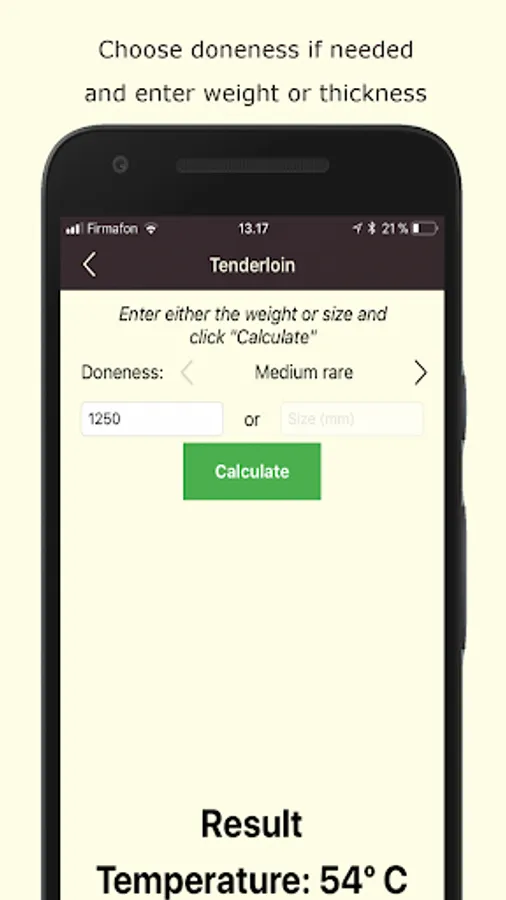 Select you required doneness and enter the thickness or weight, and then the APP will tell you how much time and what dregrees we will suggest you cook you meal at.