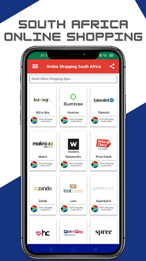 South Africa Online Shopping - Install the Online Shopping South Africa App and get access to all major online shopping portals all over South Africa like Cape Town, Durban, Johannesburg, Soweto, Pretoria, Port Elizabeth, Pietermaritzburg, Benoni, Tembisa, East London, Vereeniging, Bloemfontein.