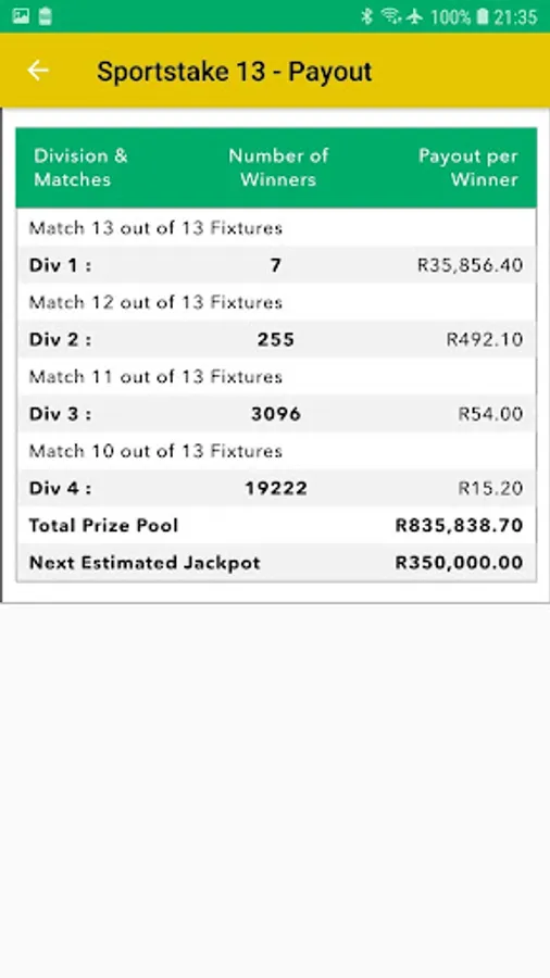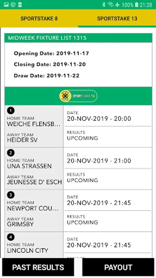 You can have the south africa sportstake 8 midweek fixture list, sportstake 13 midweek fixture list, the historical results and the payout per winner.