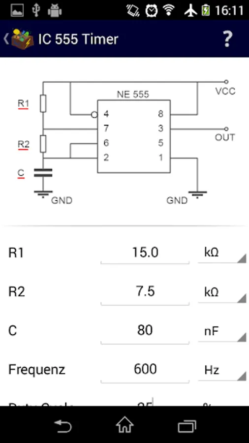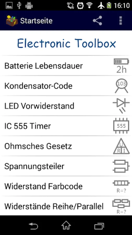 This App provides some useful electronic tools, like IC 555, voltage divider and resistor calculators.