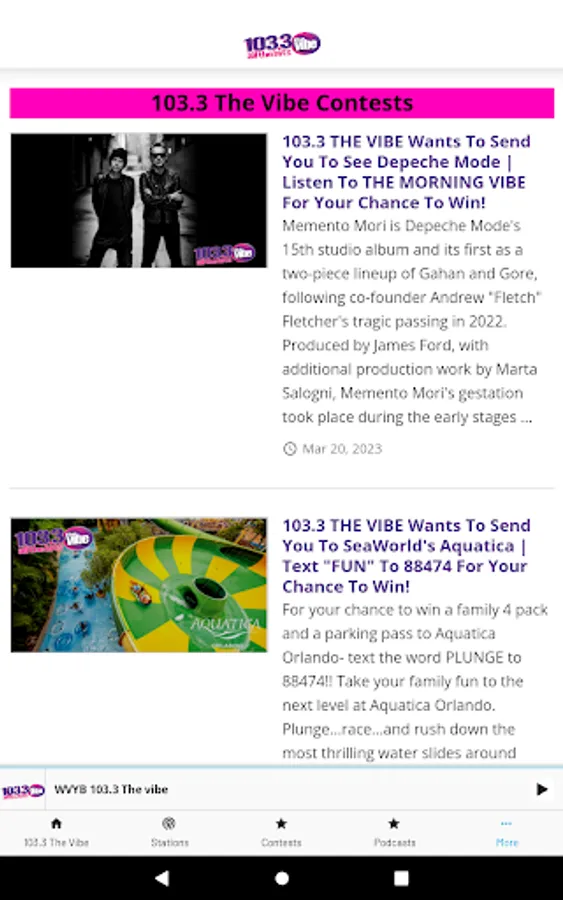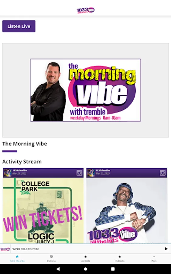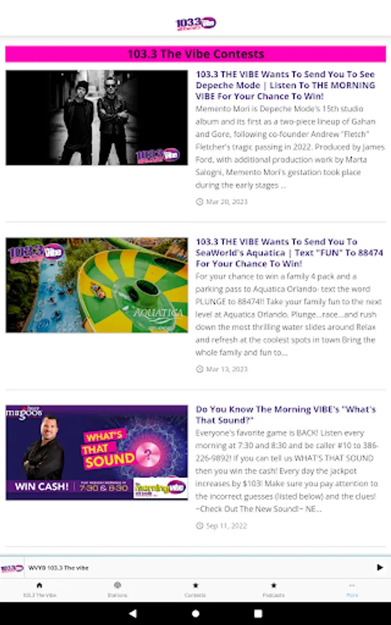 103.3 The Vibe plays all of the current favorites and Top 40 hits across the Daytona Beach area. We are an active member of the community and support many public service events, charities, and programs. We're always looking to meet listeners and be involved in community events, concerts and more. We're promotionally driven with contests, prizes and giveaways. We love using interactive promos to engage with our listeners - and of course, bring Daytona's Hit Music to the air waves. Listen daily for your chance to win some of the best prize giveaways in the area!