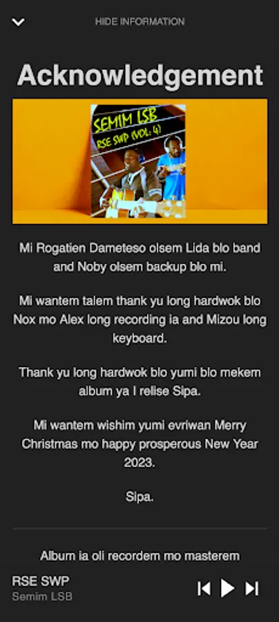 Mi Rogatien Dameteso olsem Lida blo band and Noby olsem backup blo mi. Mi wantem talem thank yu long hardwok blo Nox mo Alex long recording ia and Mizou long keyboard. Thank yu long hardwok blo yumi blo mekem album ya I relise Sipa. Mi wantem wishim yumi evriwan Merry Christmas mo happy prosperous New Year 2023. Sipa.