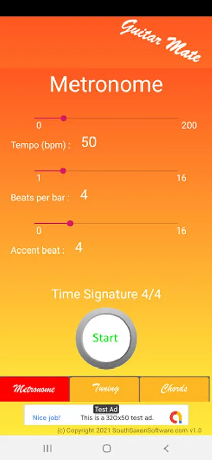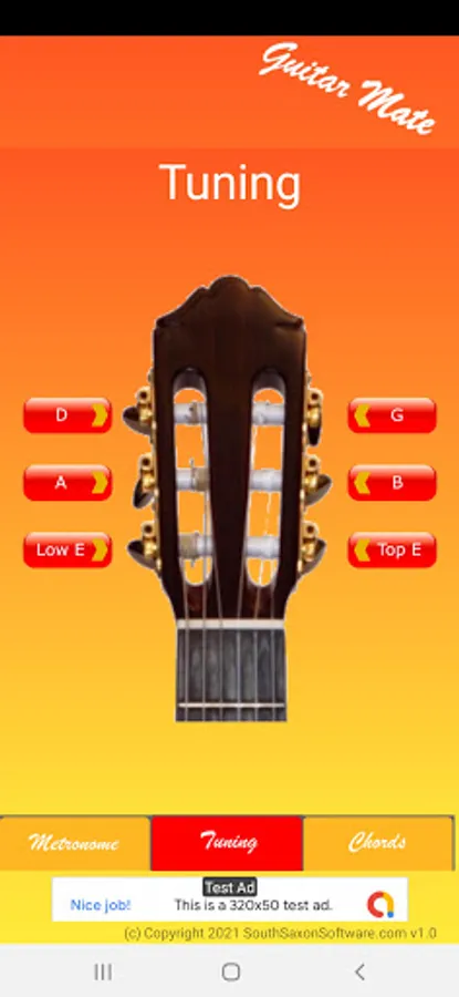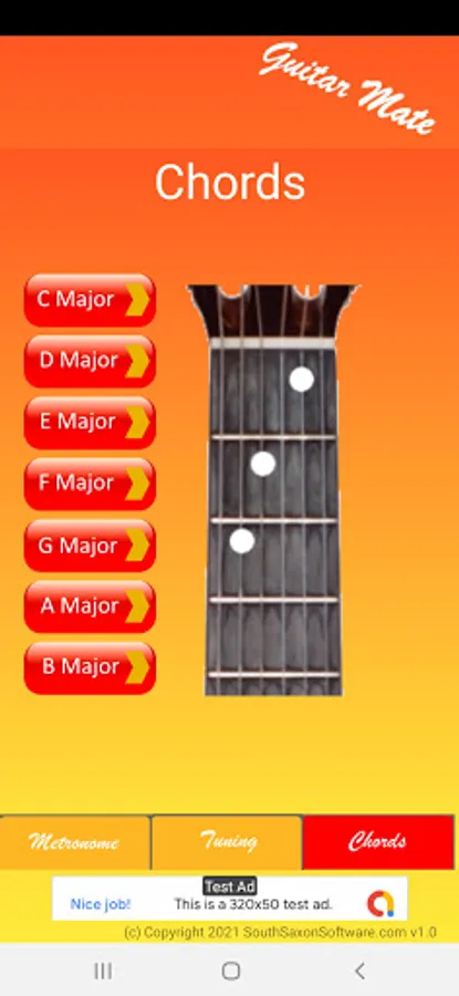 This app provides 3 basic functions : A metronome page to help with guitar playing timings, a tuning paghe giving you the standard open string tunings for a 6-string guitar plus a page of major chord fingerings (a future version may provide additional chords).