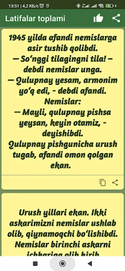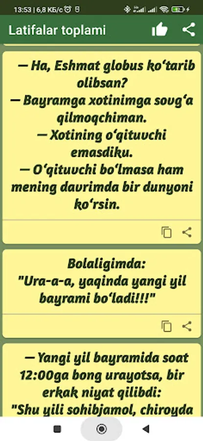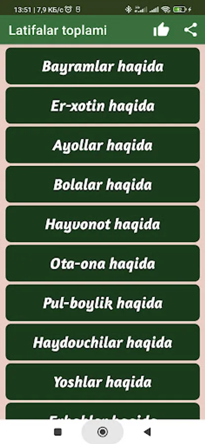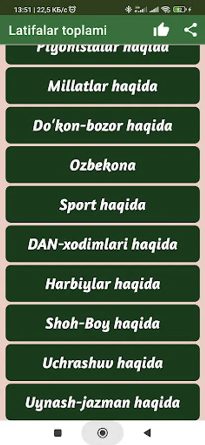 Bu ilovada har bir mavzuga alohida hazillar mavjud