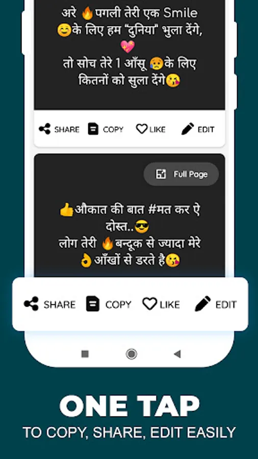 Attitude Hindi status app is a great collection of messages and quotes. Get latest Attitude Messages/Shayri/Quotes/Jokes from its huge categories in Hindi Language. There is 500+ status categories which Gives to Complete Freedom to choose Messages/Quotes According to your Mood or Occasion.