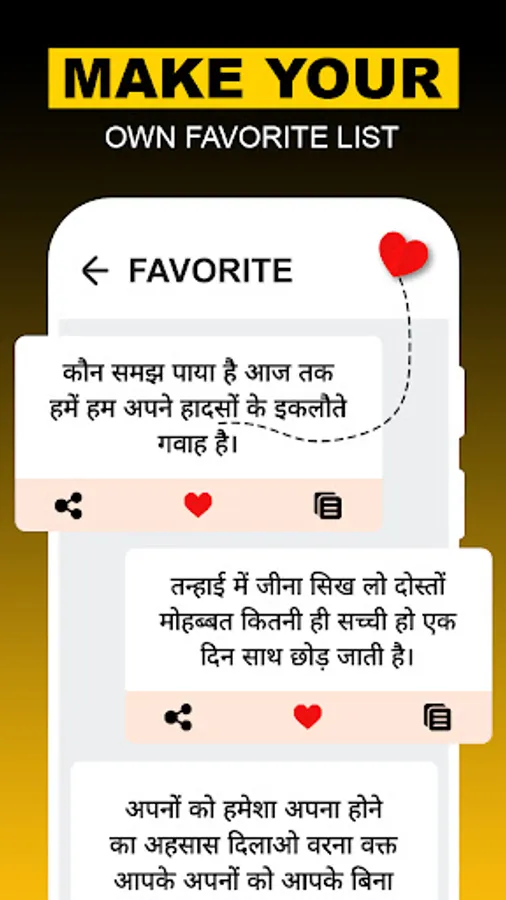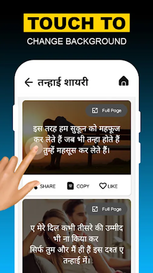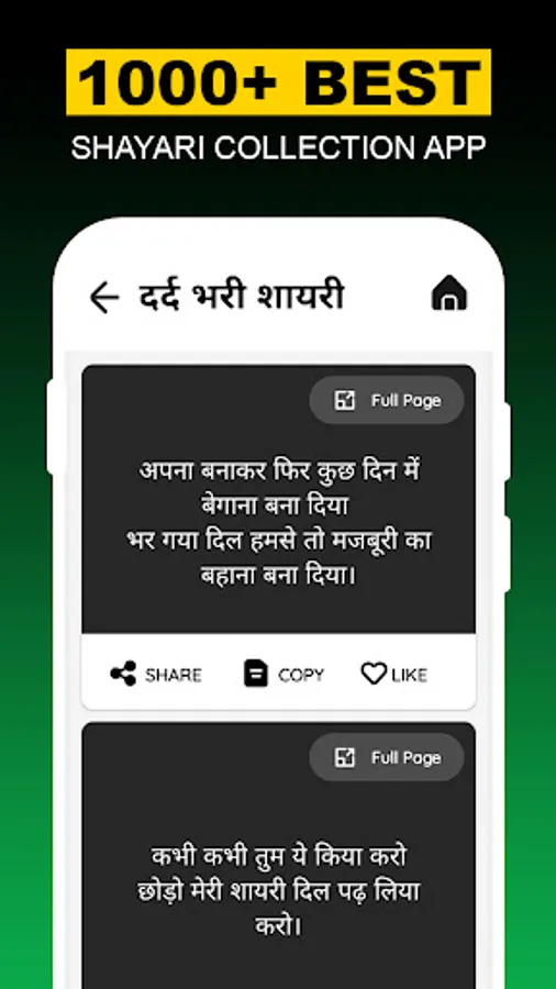 Whenever we Feel Sad and Want to Express our Sadness, This App is the Right Place for Specially Dard Bhari Shayari on Every Best in Class Categories Like Bewafa Shayari, Sad Shayari, Dhoka Shayari, Mohabbat Shayari, Broken Love Shayari is the Best Option to Express your inner Sadness on Social Networks. Here we are Having a Large Collection of Sad Shayari in hindi. You can Choose all types of Shayari According to your Mood and Share it Where you Want.