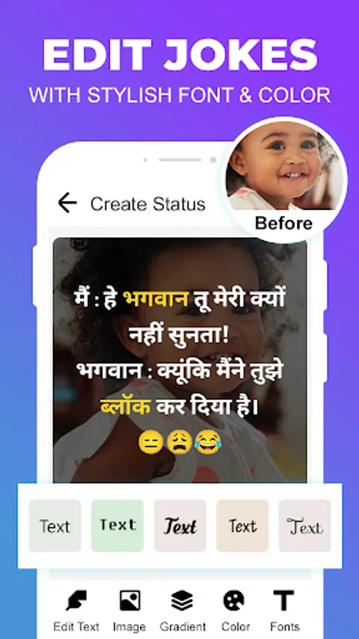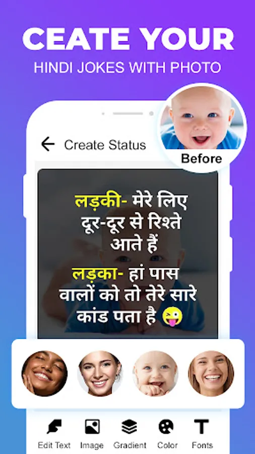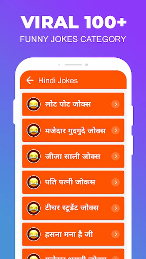 Funny Hindi Jokes - Hindi Chutkule App has different funny jokes categories which does not contains only copied Hindi Jokes with types but contains trending Hindi Jokes personalized with Emojis to grab attention unlike other apps. It is believed that it is not just about reading the joke but to feel the Jokes with eyes too.