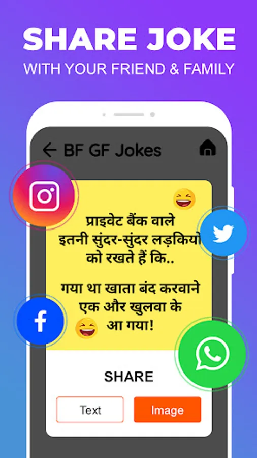 if you are Looking for a free Entertainment App to Spend hours of fun and laughing with family and Friends, Download Funny Jokes for free on your Android phone and Start Reading the Funniest Hindi Jokes. This App Provides you Collection of Popular funny Jokes and Chutkule in Hindi. All funny jokes are available in the Hindi language With Emoji. This app doesn't contain any Type of adult Jokes and It is Safe for Everyone.