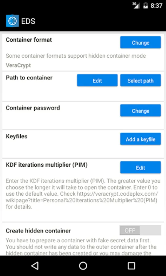 EDS (Encrypted Data Store) is a virtual disk encryption software for Android which allows you to store your files in an encrypted container. VeraCrypt(R), TrueCrypt(R), LUKS, EncFs, CyberSafe(R) container types are supported.