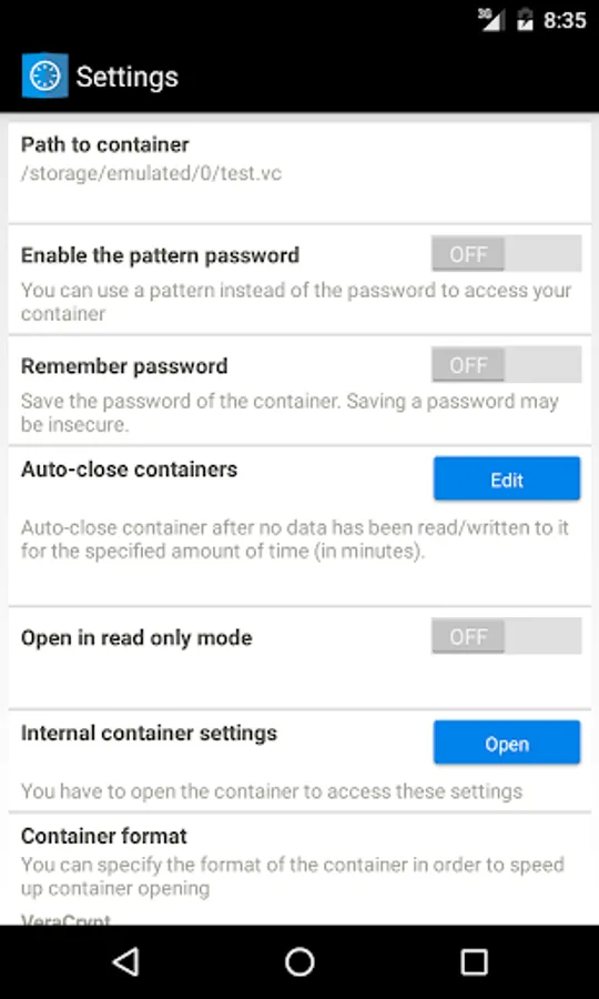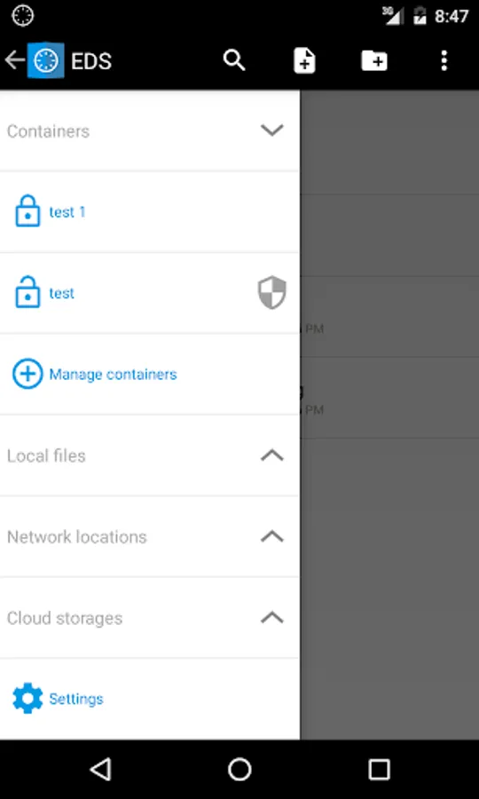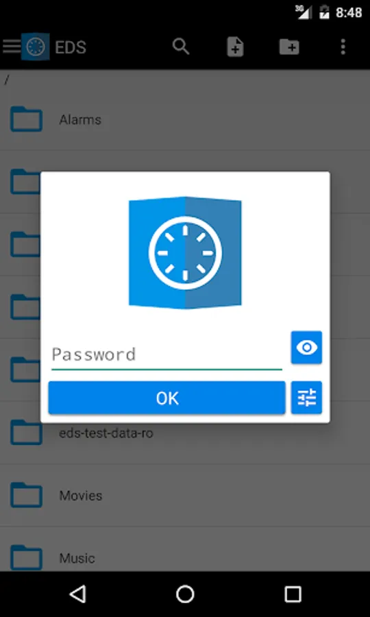 EDS (Encrypted Data Store) is a virtual disk encryption software for Android which allows you to store your files in an encrypted container. VeraCrypt(R), TrueCrypt(R), LUKS, EncFs container types are supported.