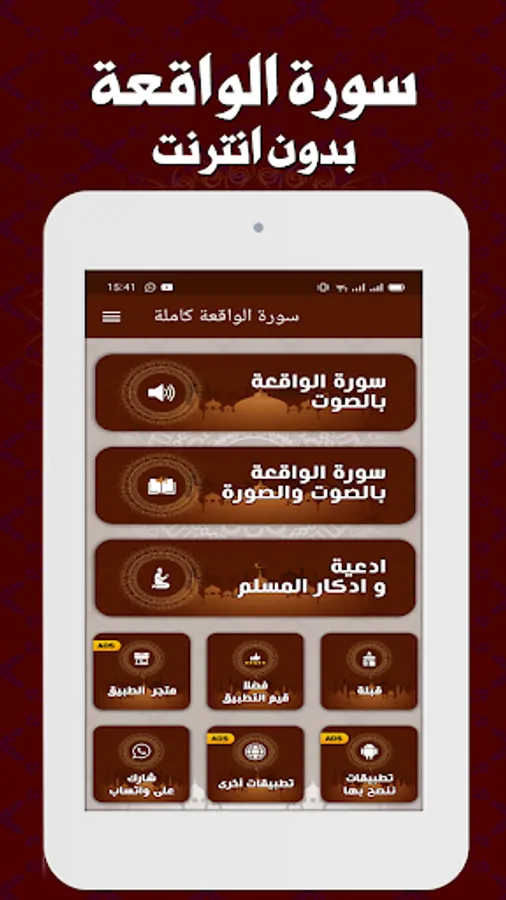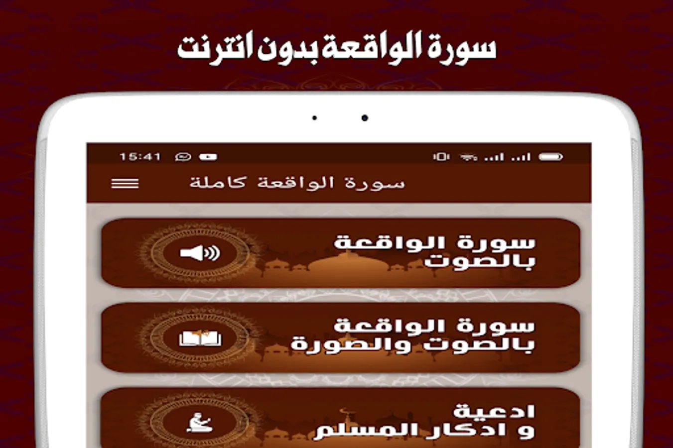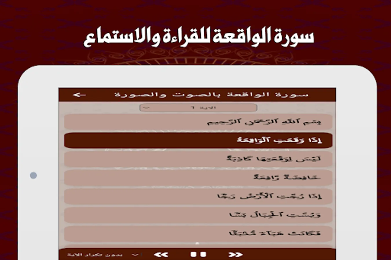 The application of Surat Al-Waqi’ah without the Internet allows users to listen to Surat Al-Waqi’ah with the voice of the most famous Arab reciters without the Internet. With the new update, the user can read and listen to the verses of Surat Al-Waqi’ah at the same time, in addition to reading the daily dhikr from the Book and the Sunnah without the net and knowing the qiblah of prayer without the net.