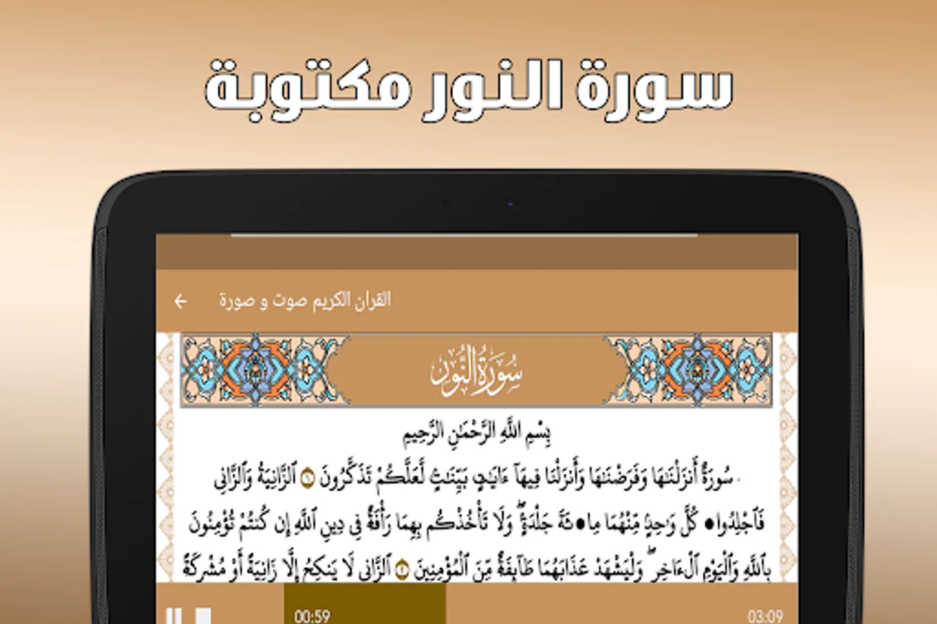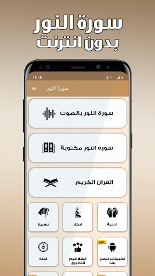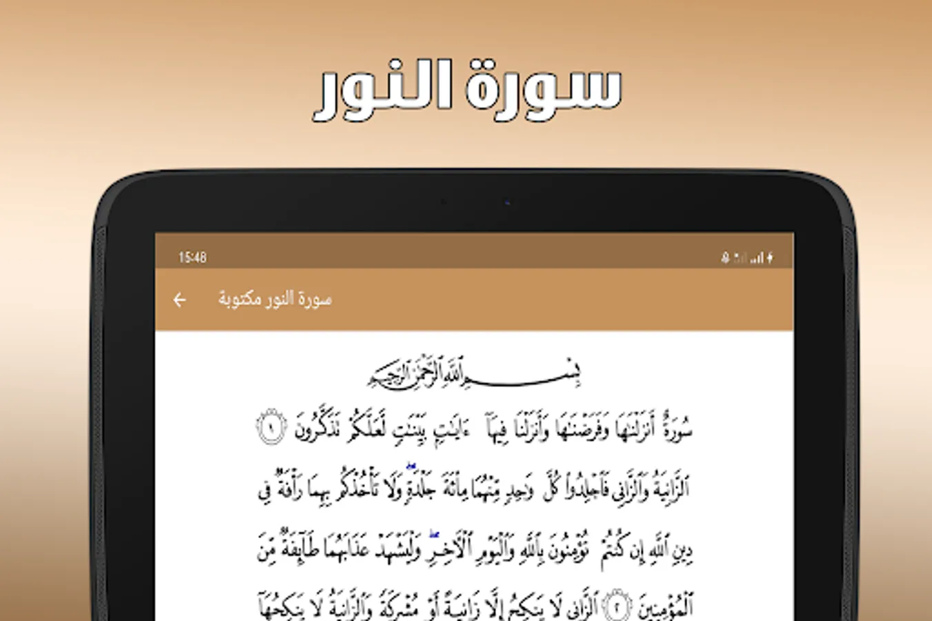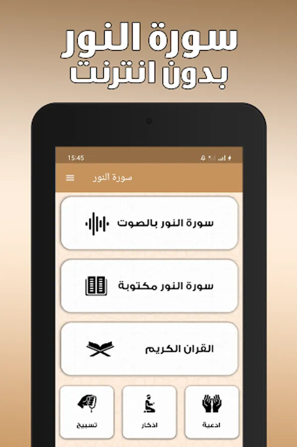 Surat Al-Nur written without the Internet is a very useful application that allows users to read and listen to Surat Al-Nur from the Holy Quran without the need for an Internet connection.