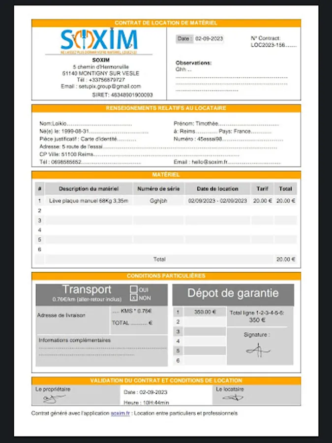 No more administrative hassle! Our friendly user interface allows you to easily write rental terms and share them with the equipment owner. You can also add all the necessary information such as the duration of the rental, the dates and any modifications, our system will automatically calculate the price of the rental and the deposits according to the information you have provided beforehand.