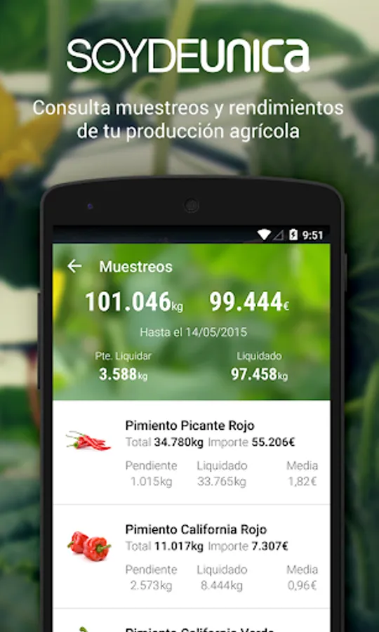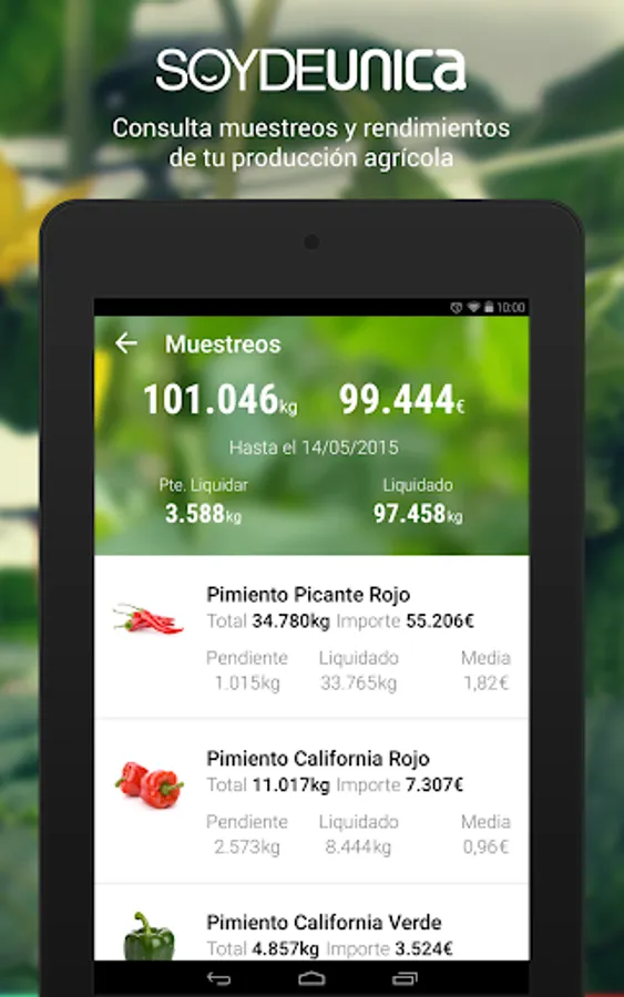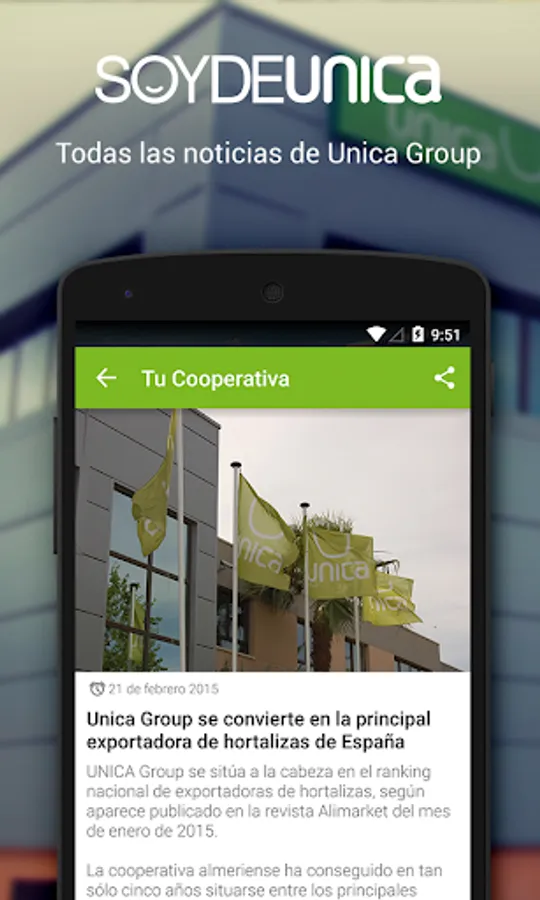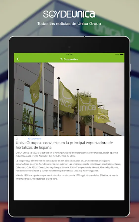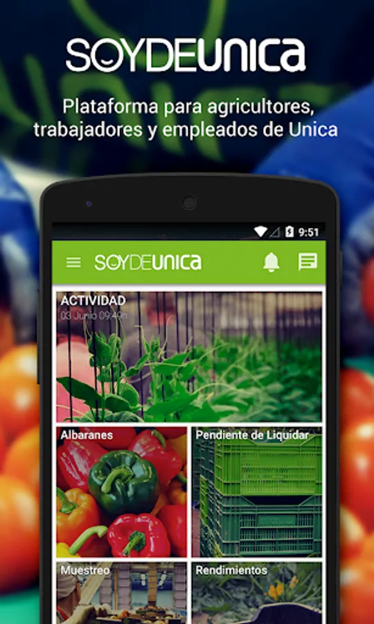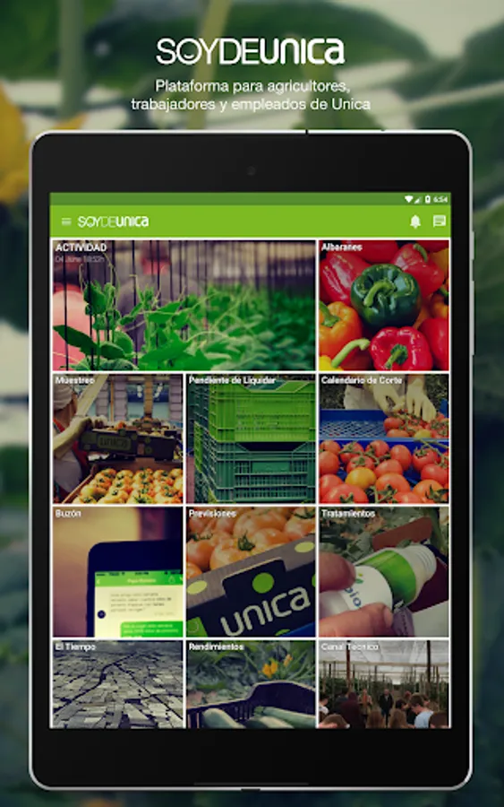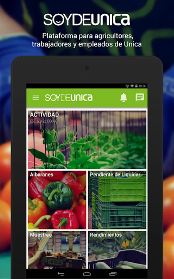 Soydeunica is a platform for members, workers and employees of Unica Group. Through the mobile application for iOS and Android enabled devices, smartphones and tablet, you can view the invoices, returns, surveys, forecasts and other services in agricultural production each year.