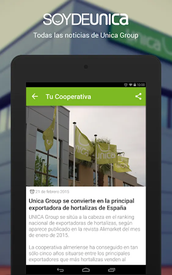 The mobile application soydeunica facilitates control of agricultural production during the campaign. It has a direct communication channel with Unica Group, with all the most important information through news channels and tools such as provisions that facilitate the socio establish direct contact with the sales department.