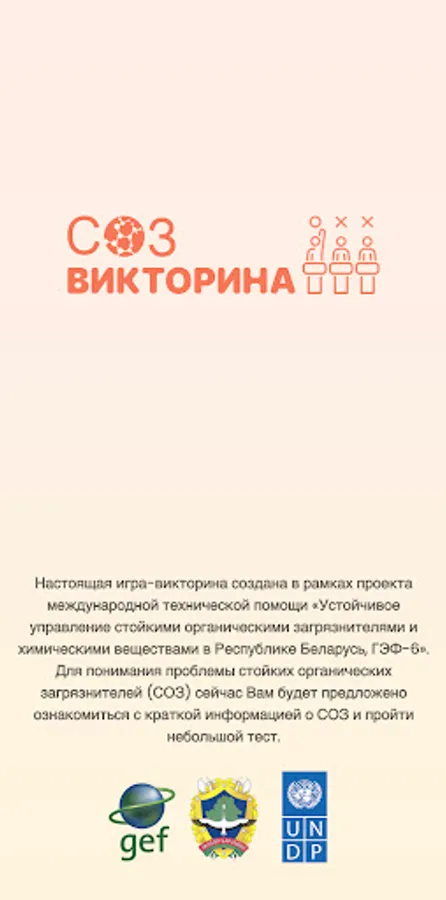 This quiz application was created within the framework of the international technical assistance project "Sustainable management of persistent organic pollutants and chemicals in the Republic of Belarus, GEF-6" and is designed to raise public awareness of persistent organic pollutants (POPs).