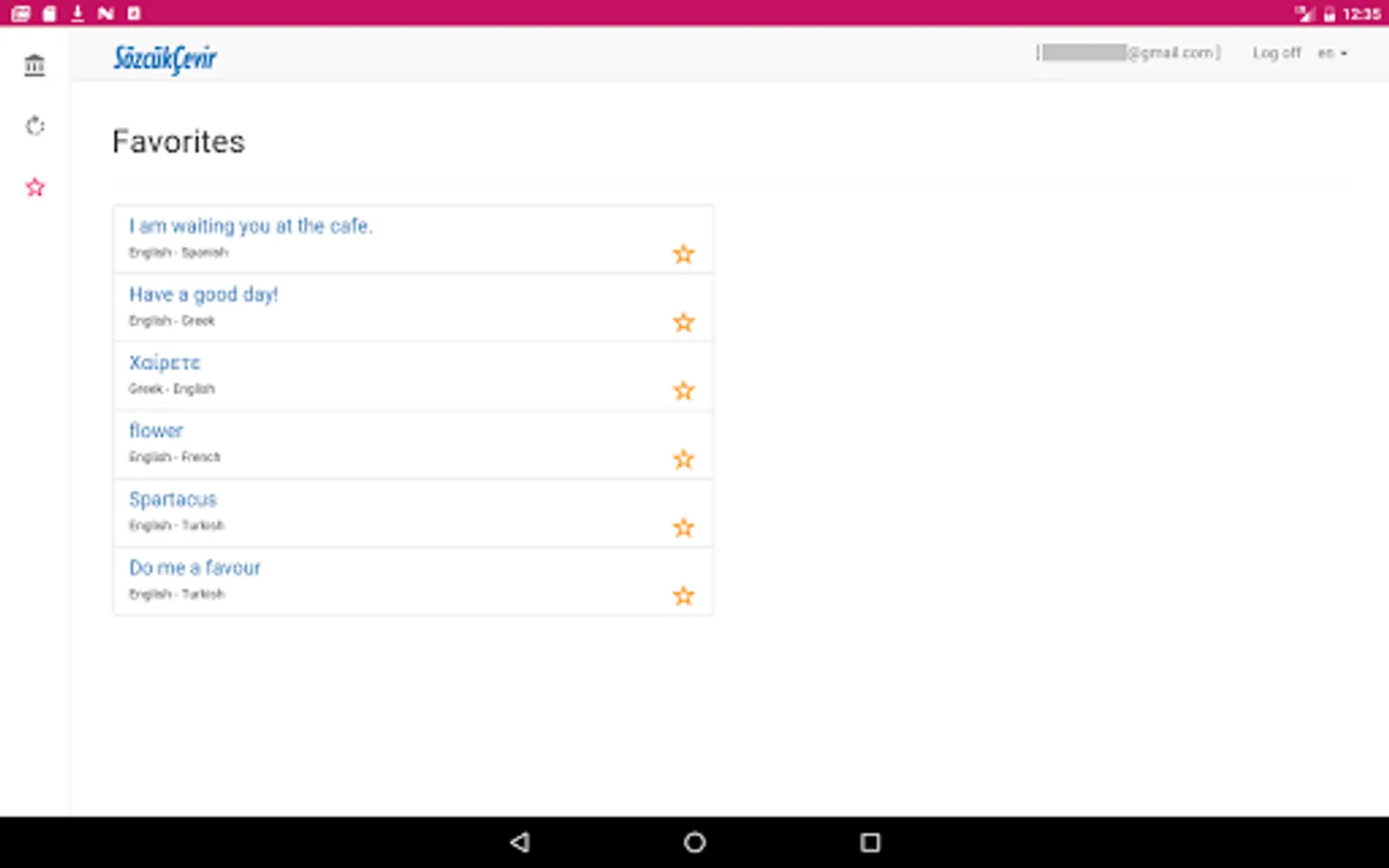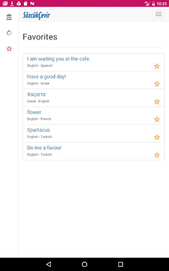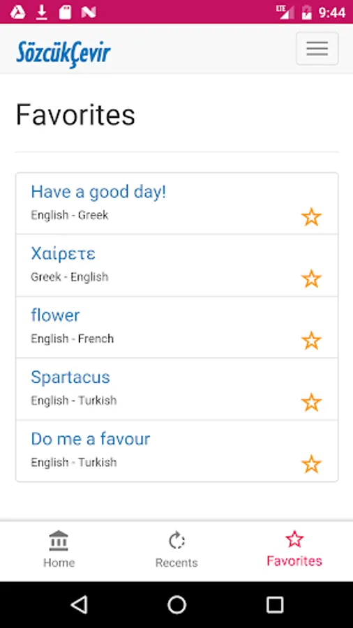 ✓ Now, you can save any translation or definition of a word or text in the favorites to quick access to it again. Just tap the start icon in the top right after you search the word that you want and we'll save it in your favorites. To show the favorites you need to tap the left button of your phone and choose Favorites.
