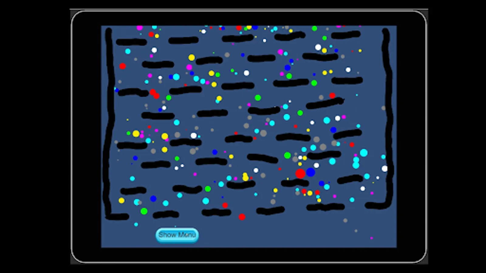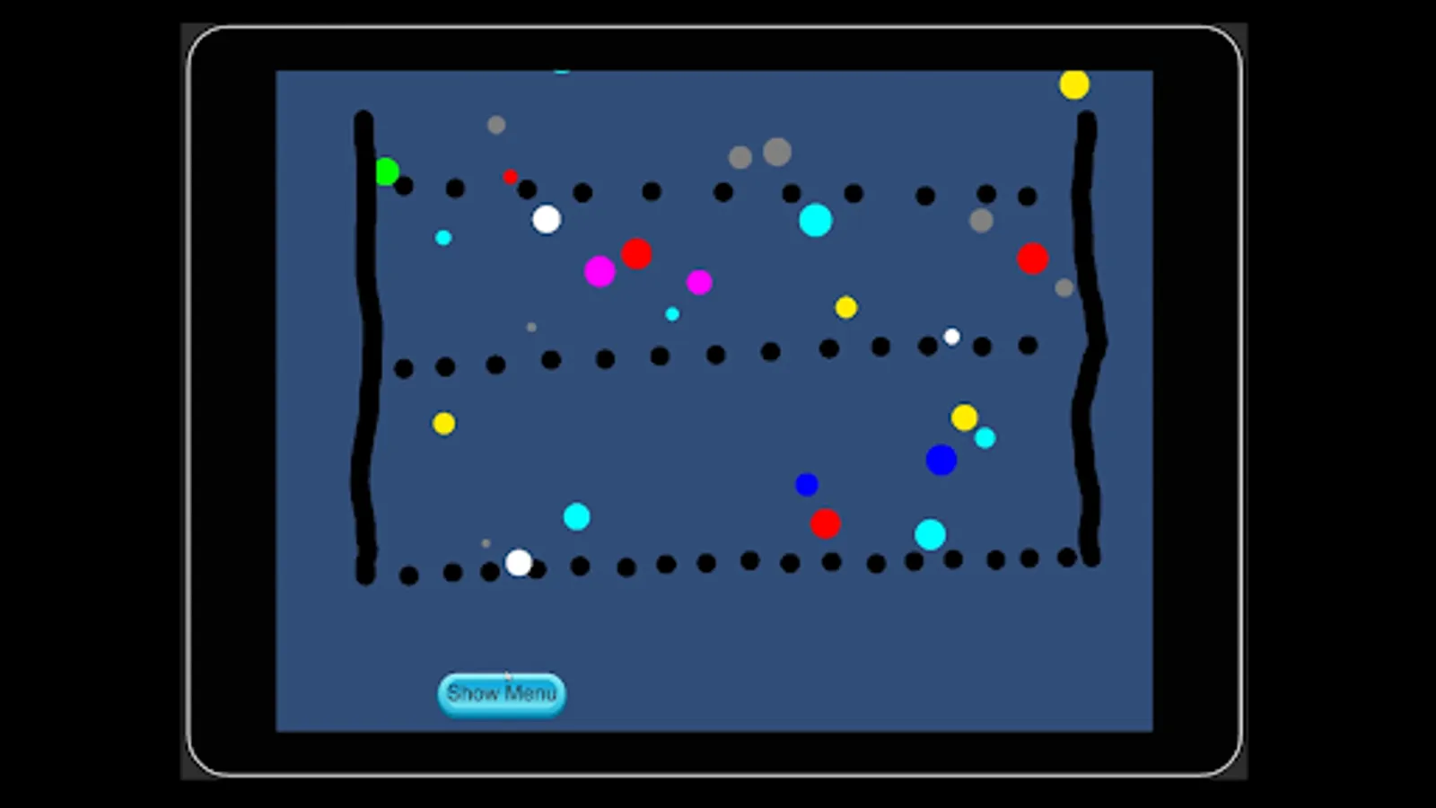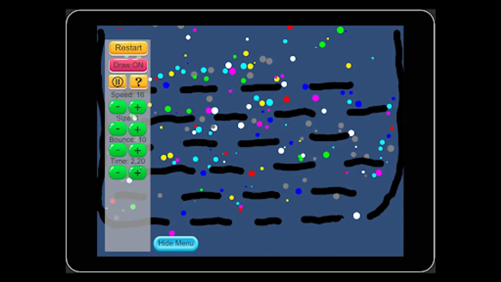 Using this application you simulate bouncy balls. The balls bounces from the surfaces which are defined by the user. User defines the surfaces by drawing lines or curves on the screen. Therefore number of schemes is unlimited and it is up to users imagination.