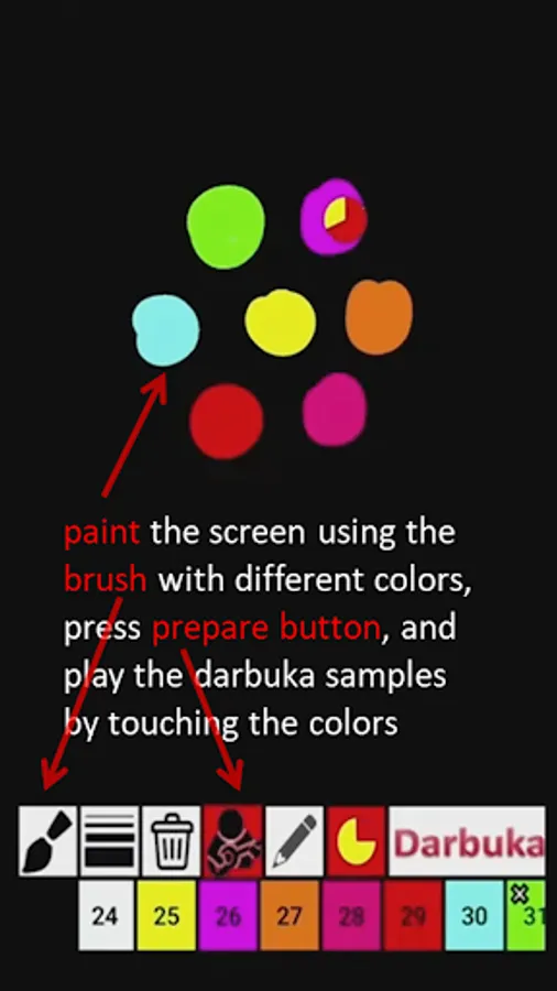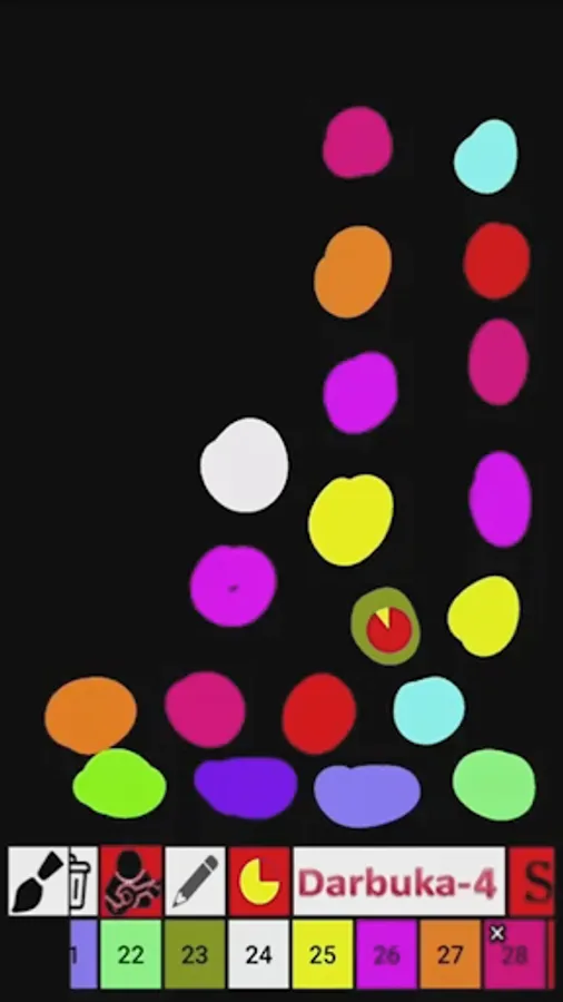 In this application, you can draw darbuka samples on the screen using a color palette. Each individual color in the palette corresponds to a darbuka sample. So you can play the rhythms you want on the screen. By tapping on the colors on the screen you can play pieces.