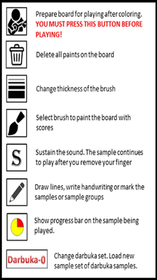 There are ten different darbuka sample set with different styles in the application. You can draw more than one instrument on the screen at the same time.