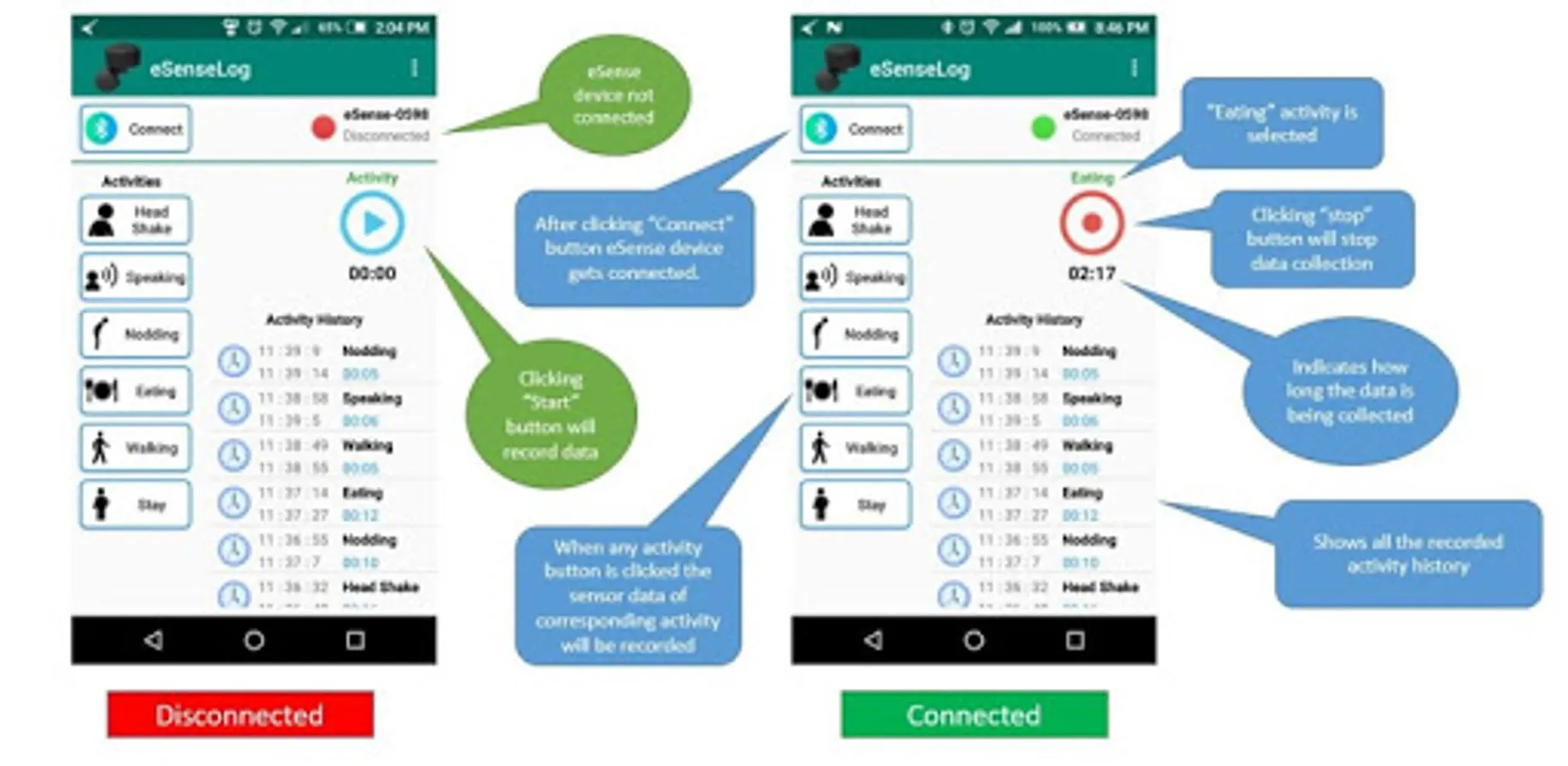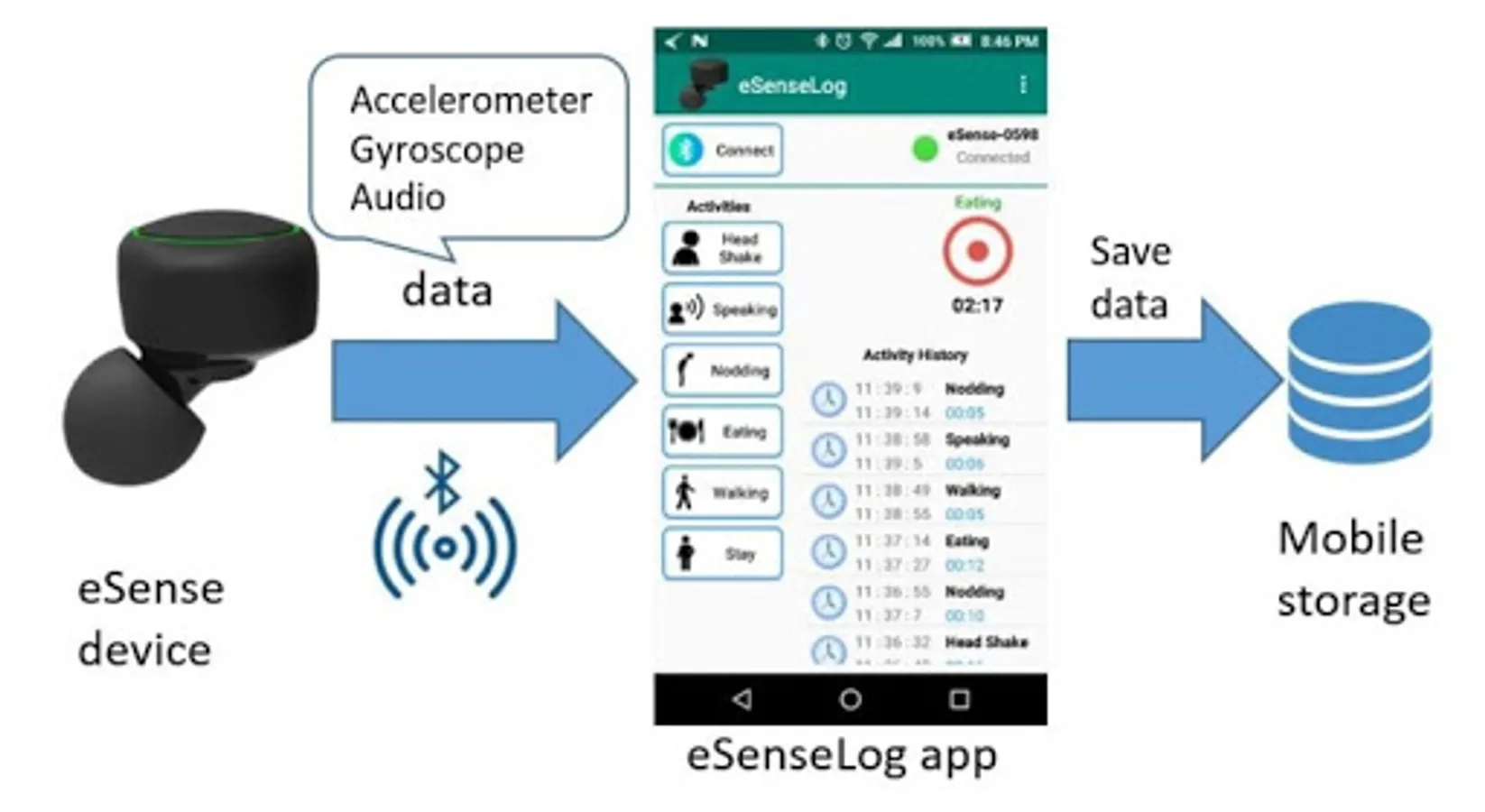 * The app establishes connection with a Bluetooth Low Energy (BLE) earable device named "eSense". The device is developed by NOKIA Bell Labs Cambridge.