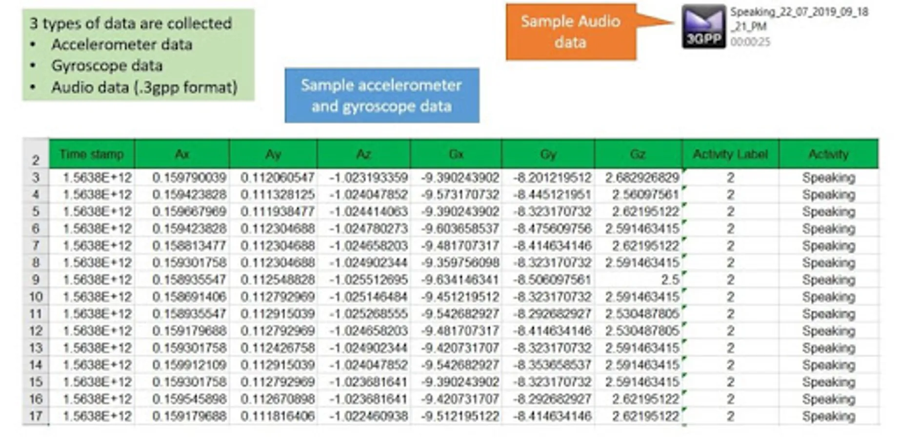 * The device contains sensor which provides accelerometer and gyroscope data. From this data hand and mouth related activities like eating, swallowing, speaking, head shaking etc. can be recognized by machine learning algorithms like CNN, LSTM.